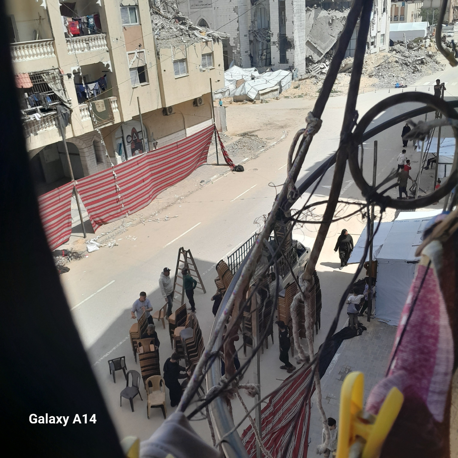 The image, oriented sideways, captures a bustling street scene from an elevated perspective, likely from a balcony or window, with dark cables and a yellow clothes peg prominent in the immediate foreg…read more