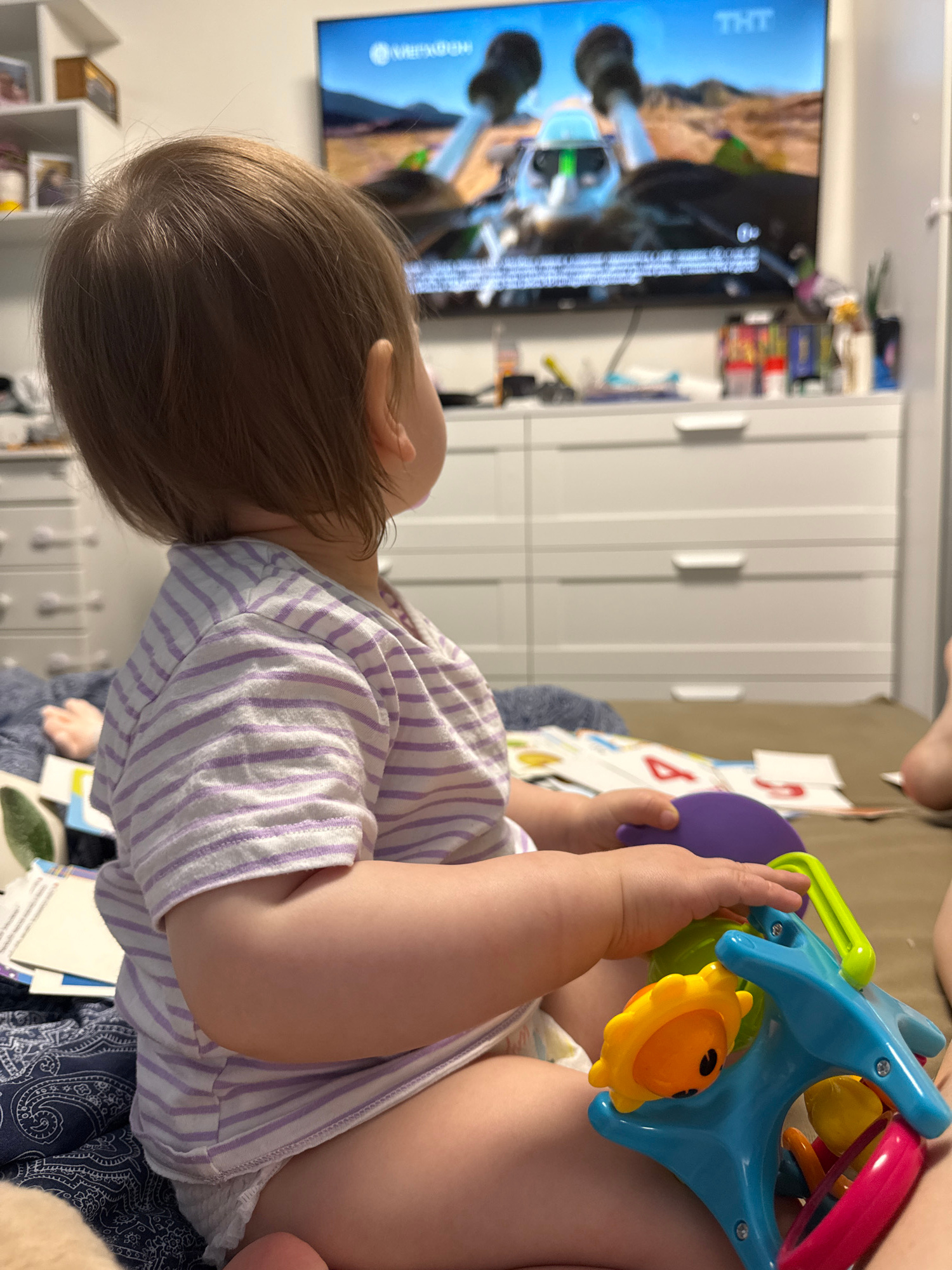 A baby is sitting and holding a colorful toy. The baby is wearing a white and purple striped shirt and a diaper. A television is visible in the background. The television is turned on and shows a land…read more