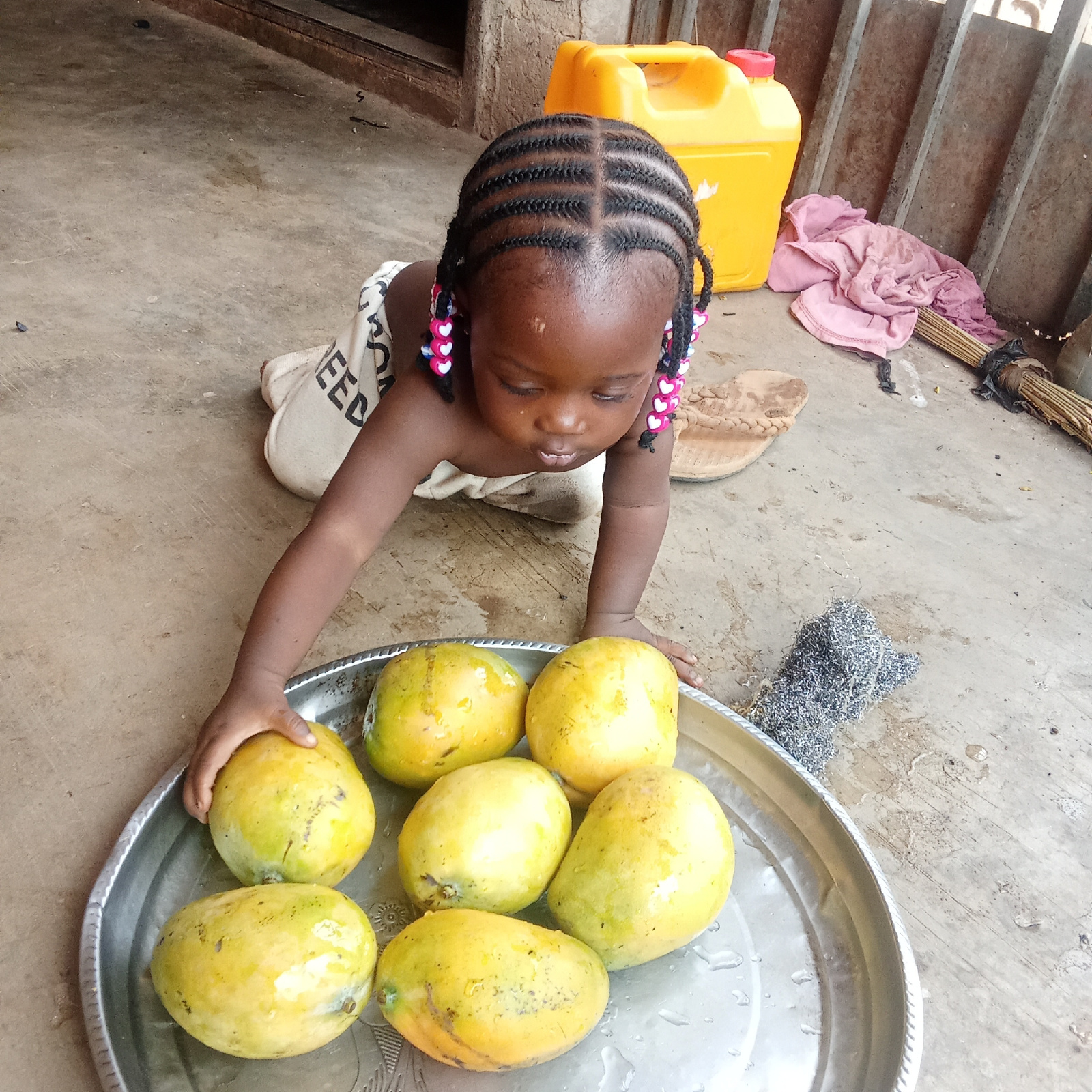 A young child with braided hair adorned with heart-shaped beads is kneeling on a cement floor in an outdoor space in Akwanga, Nigeria. The child is reaching towards a silver tray filled with seven rip…read more
