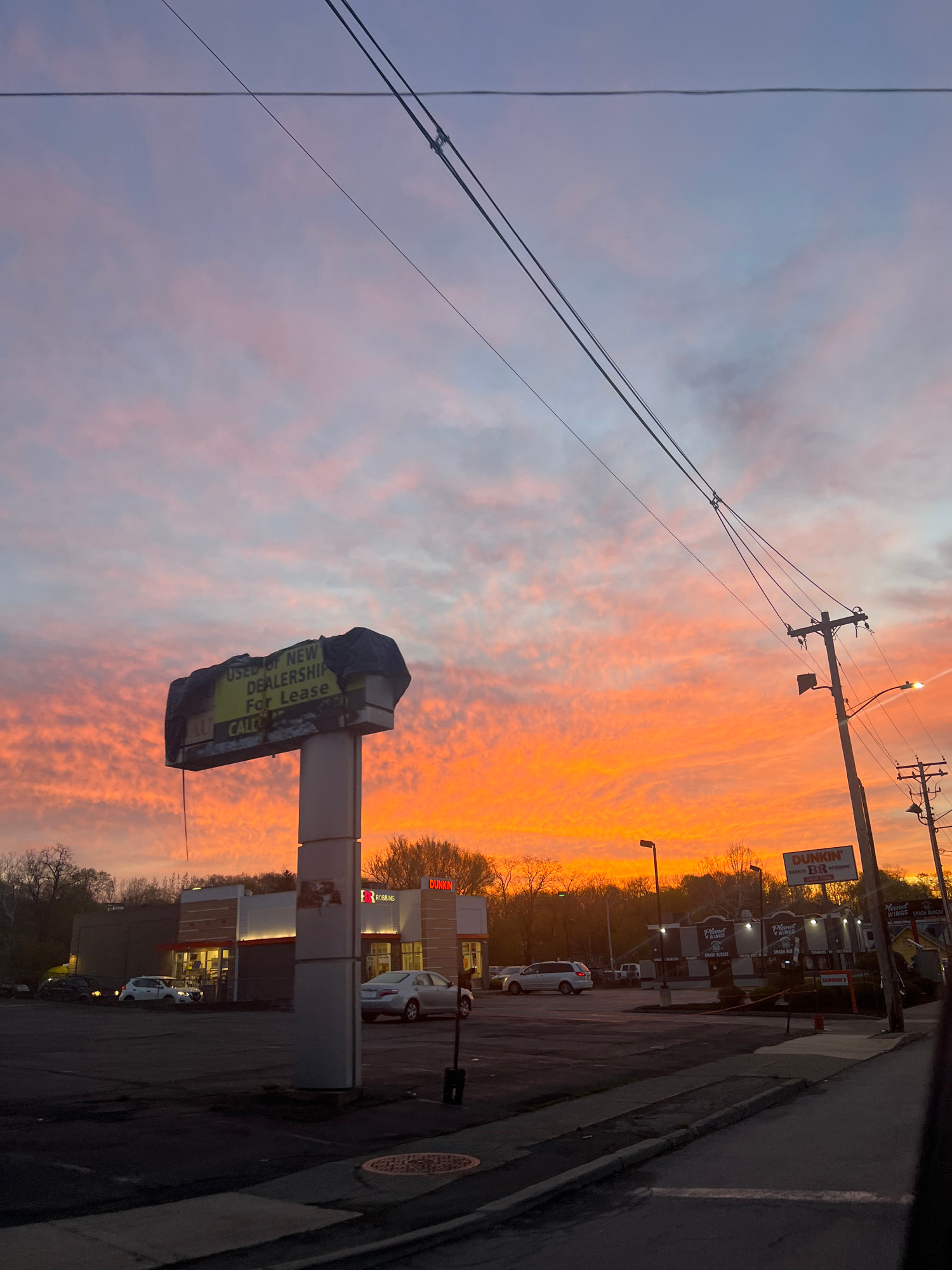 Here's a concise description of the image: The image captures a vivid sunrise or sunset in a commercial area, possibly in the City of Newburgh, United States of America (based on the identified busin…read more