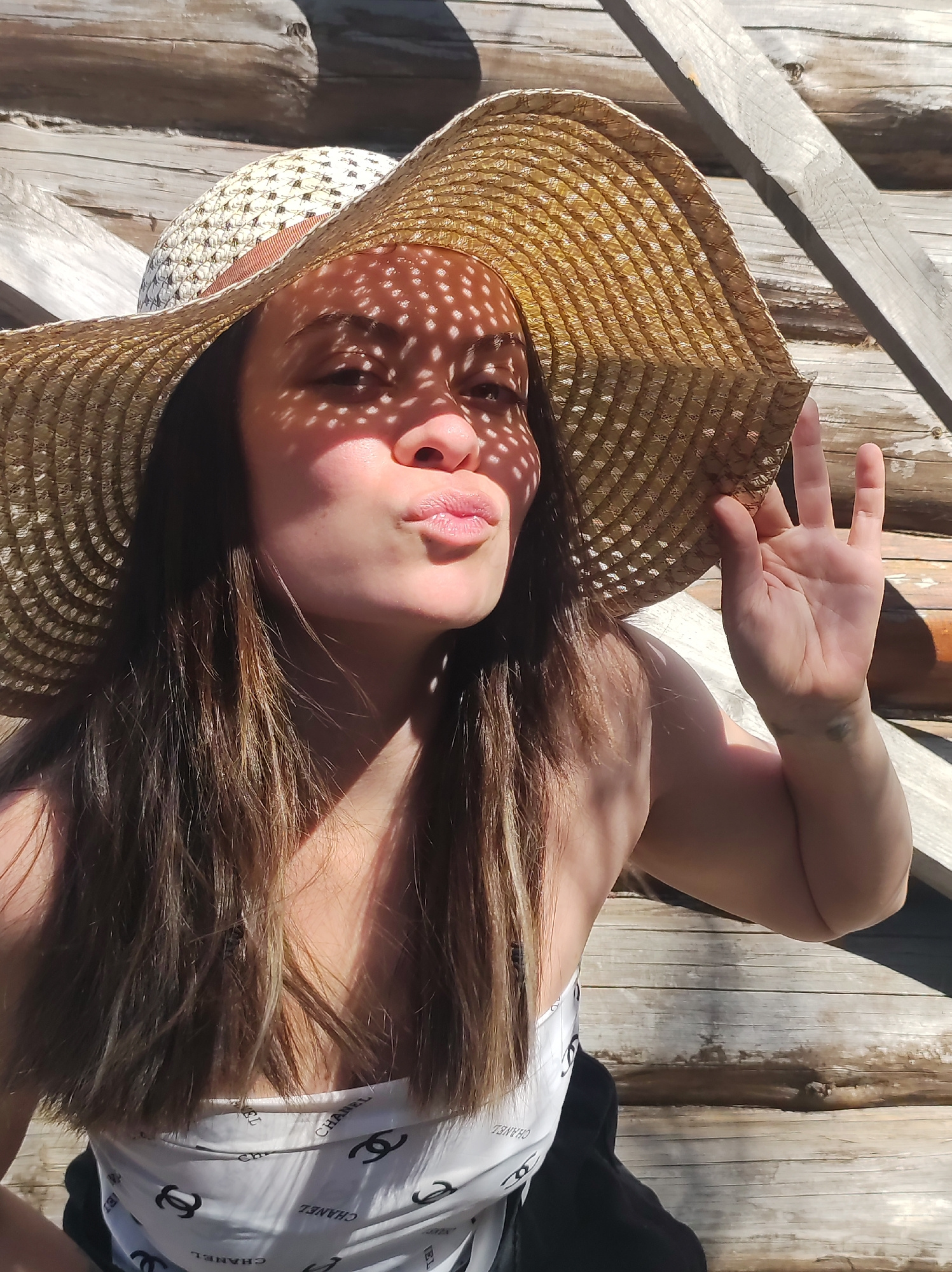 A young woman is captured in a sunlit, close-up portrait, likely a selfie, against a rustic wooden background. She appears to be in her 20s or 30s, with long, straight dark brown hair falling over her…read more