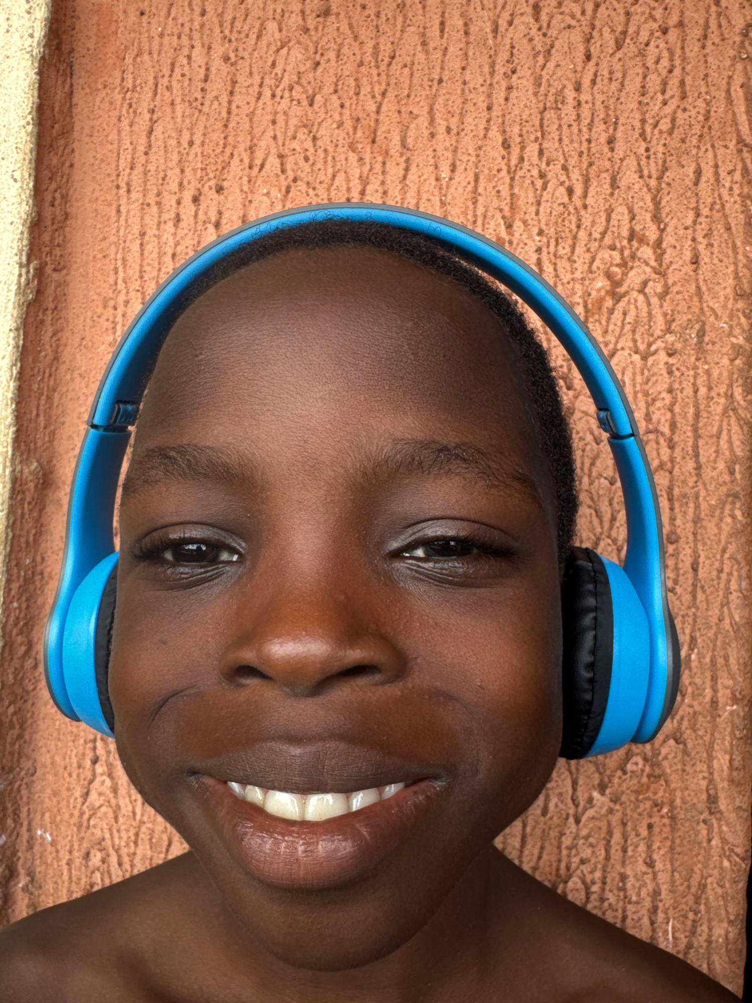 A dark-skinned child is depicted from the neck upwards, wearing blue over-ear headphones with black earcups. The child is looking upwards and smiling. The background has a textured wall of orange-brow…read more
