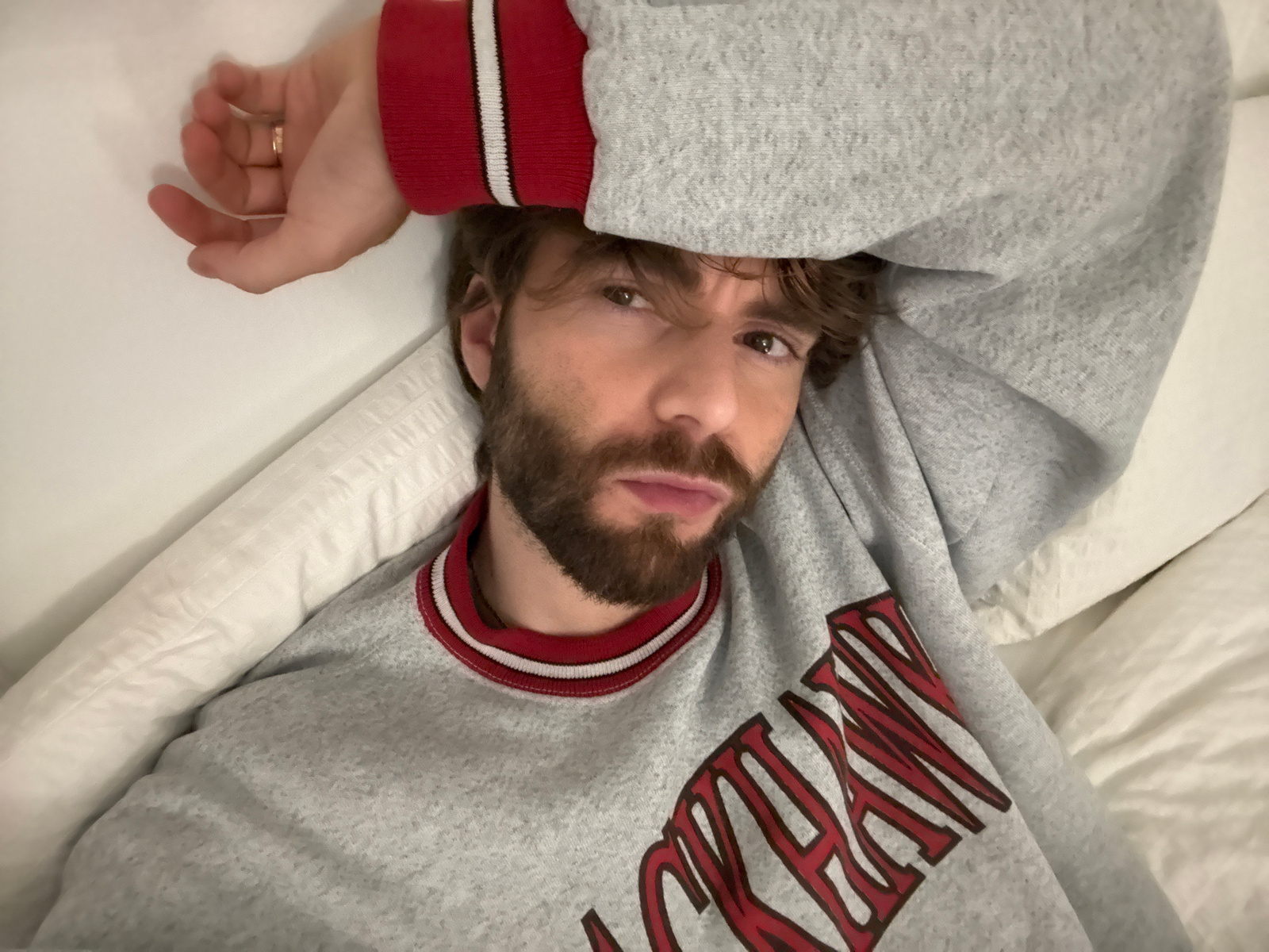 A person is lying on a white bed, wearing a gray sweater with red and white trim on the collar and cuffs and large red lettering across the chest. The person has light brown hair, a beard, and is look…read more