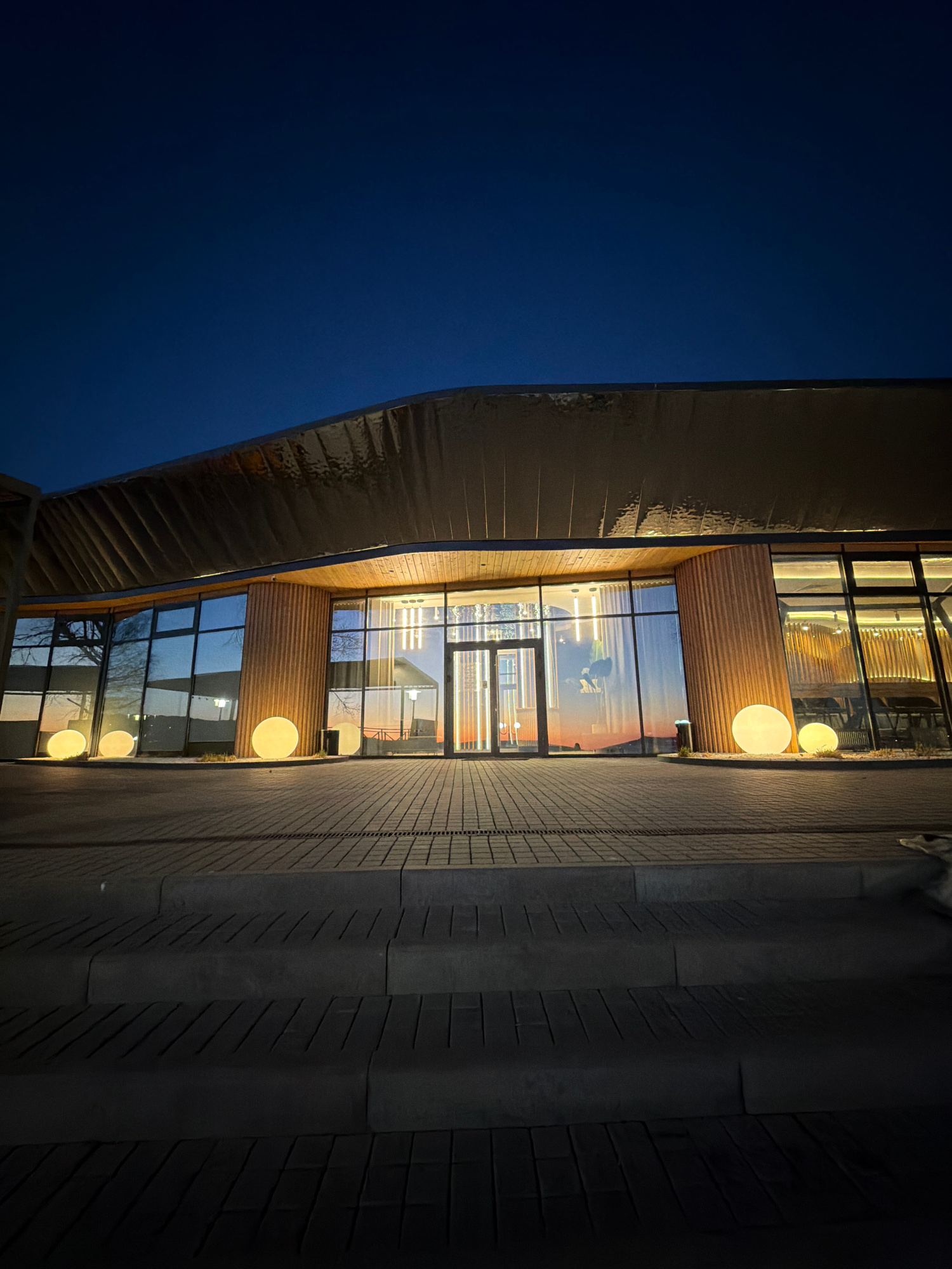 Here is a description of the image: The image depicts a building at dusk in Votkinsk, Russia. The building features a facade with a curved, reflective metal element on the left and a series of largeβ¦read more