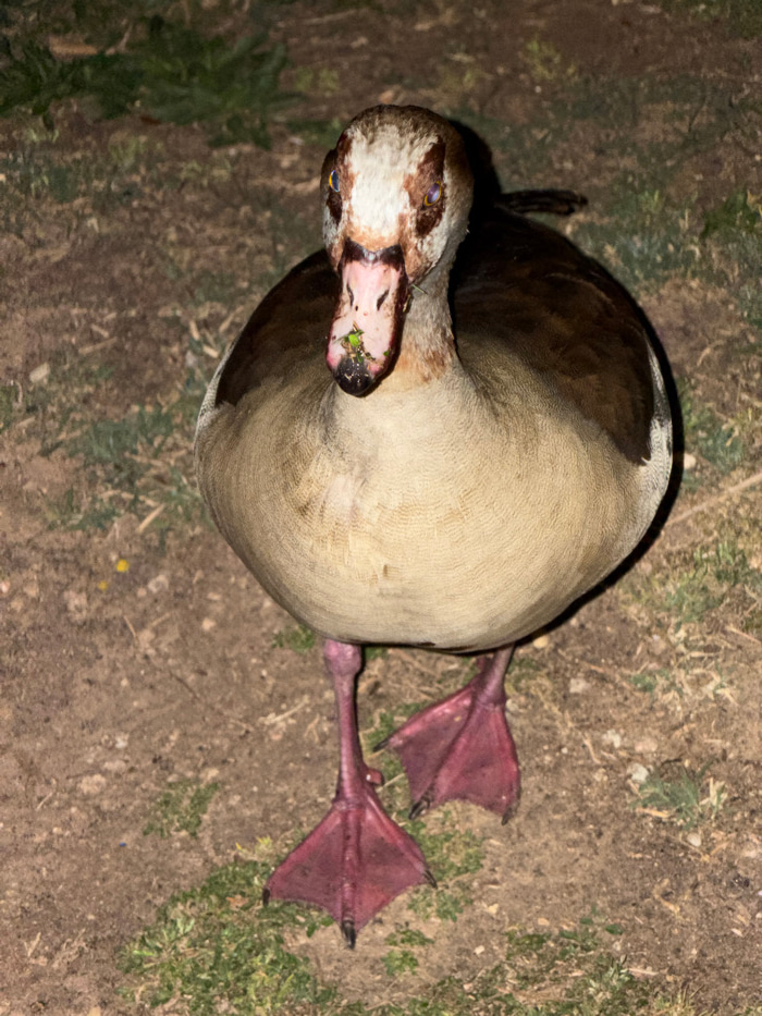 An Egyptian Goose (Alopochen aegyptiaca) stands upright, facing directly towards the viewer, on a patch of dry dirt and sparse green grass. The bird exhibits a white face with a brown crown and promin…read more
