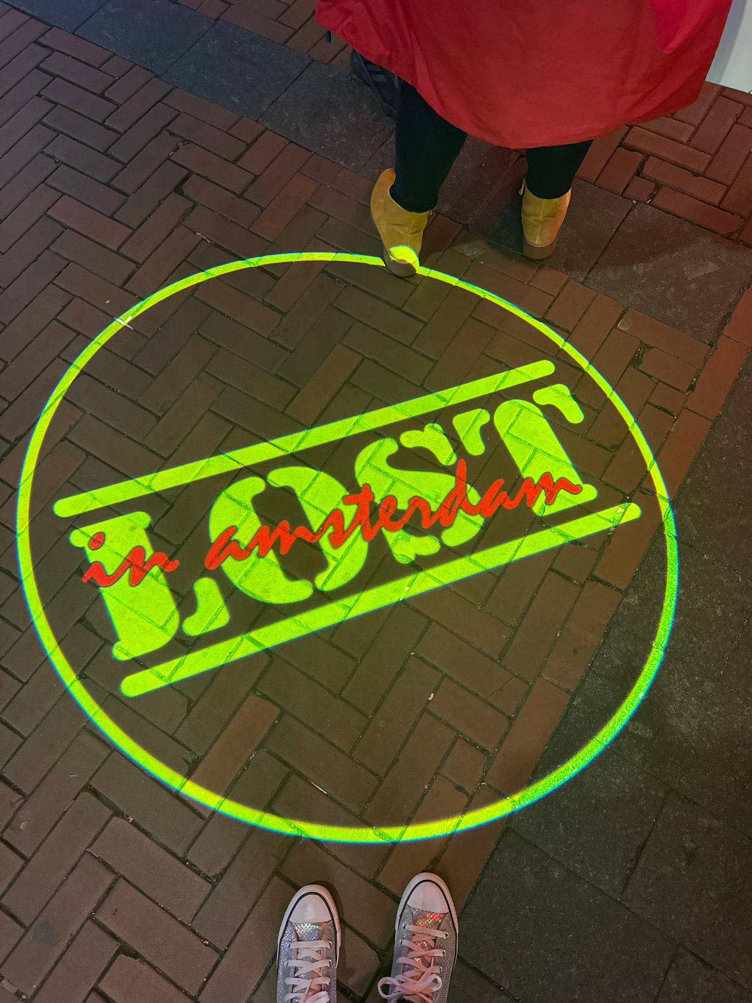 A street in Amsterdam, Netherlands is illuminated with a green and red logo projected onto the brick pavement. The logo is a vertical rectangle outlined in green, with an image inside made up of abstr…read more