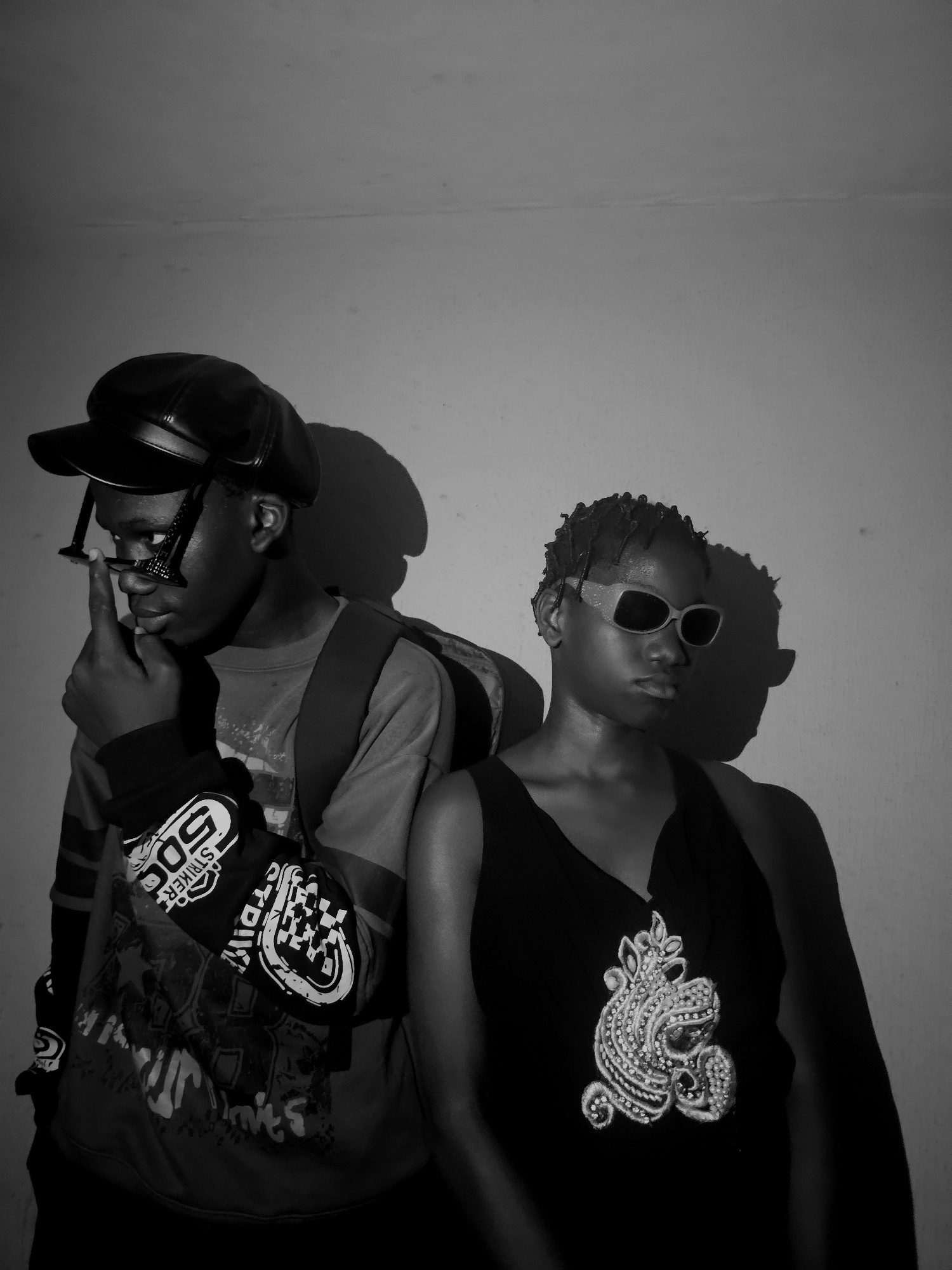 Two individuals are captured in a monochrome image against a plain wall. The person at the bottom wears a cap, glasses, and a patterned jacket, appearing to adjust their glasses. The upper individual…read more