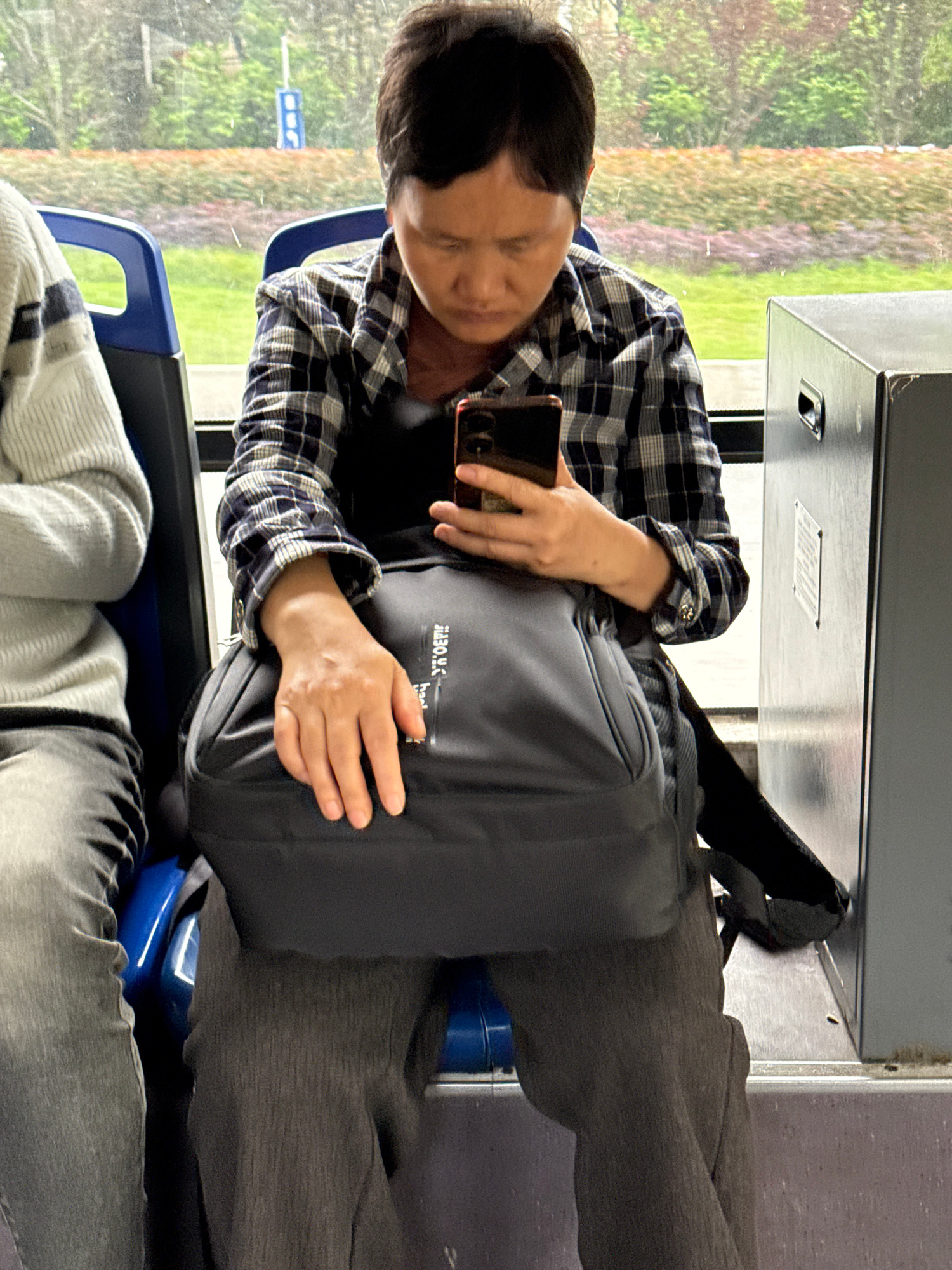 A man is seated on a bus, using a smartphone. He is wearing a plaid shirt, gray pants, and a black backpack. The bus window shows greenery outside, suggesting a moving vehicle. The image orientation iβ¦read more