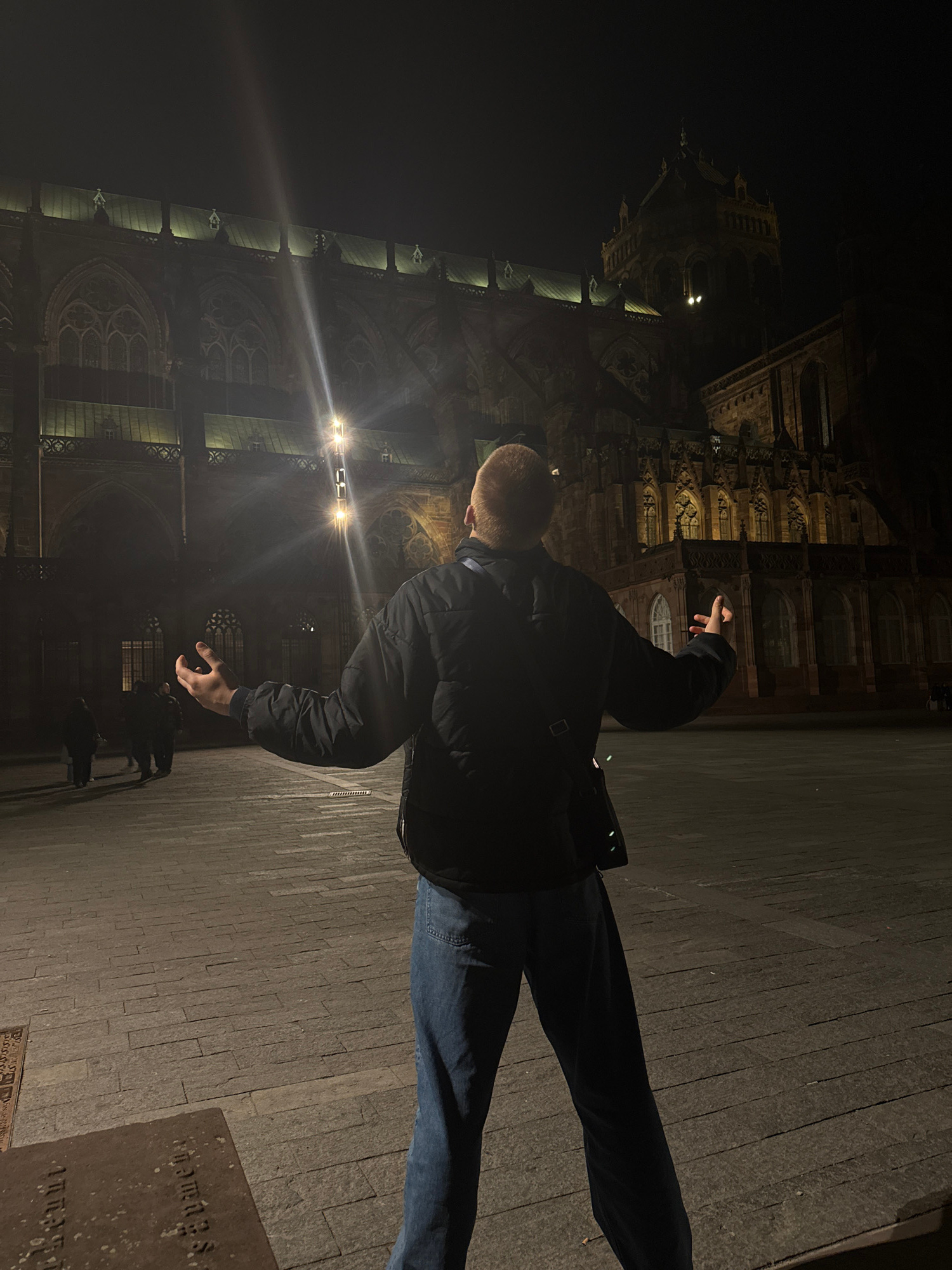The image captures a person standing on a paved surface at night, positioned in front of Strasbourg Cathedral. The person is wearing a dark jacket and jeans and has their arms raised, with their finge…read more