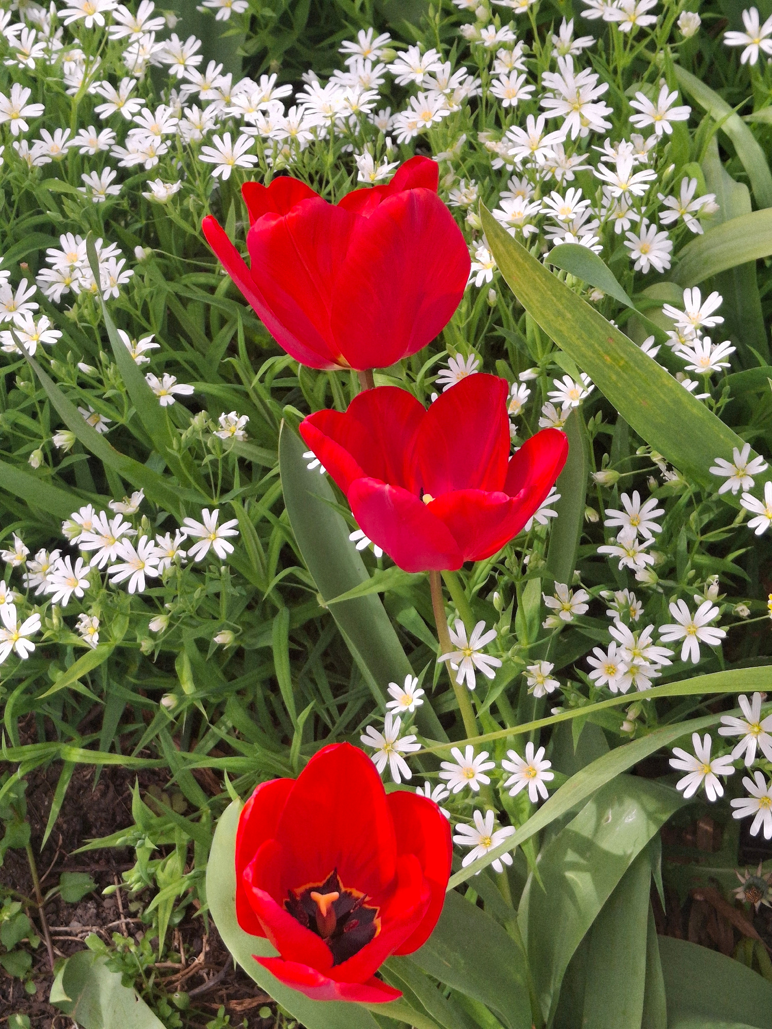 The image captures a vibrant close-up of a garden scene, dominated by three striking red tulips amidst a lush carpet of small white flowers. The perspective is slightly overhead, looking down into the…read more