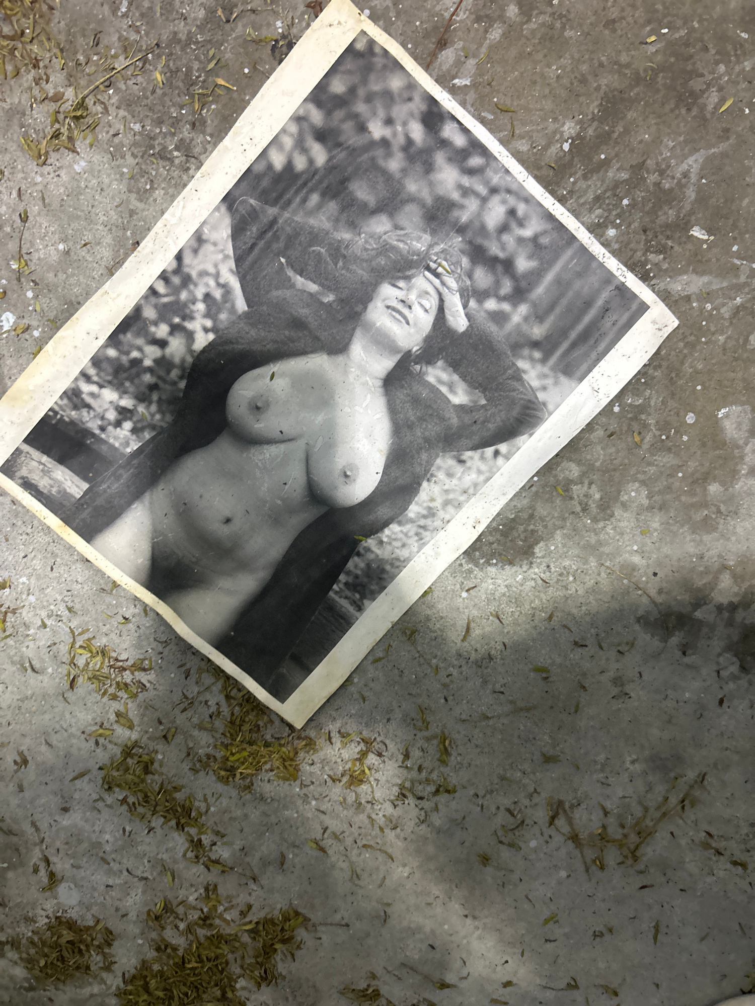 A black and white photograph of a nude woman lies on a mottled, concrete surface scattered with dry, yellow leaves and debris. The photograph, which has a white border, is oriented at a diagonal. The…read more