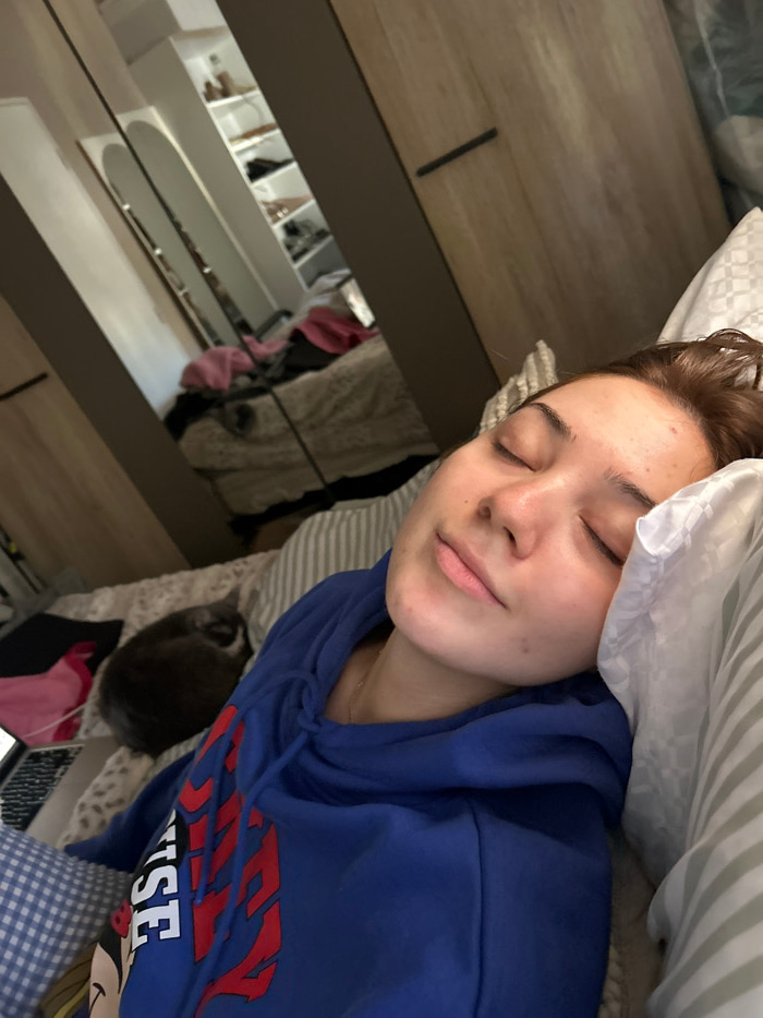 The image displays an indoor scene within a residence located in Schiltigheim, France. A young female is depicted resting on her right side in a bed, her eyes closed. She has light skin and brown hair…read more