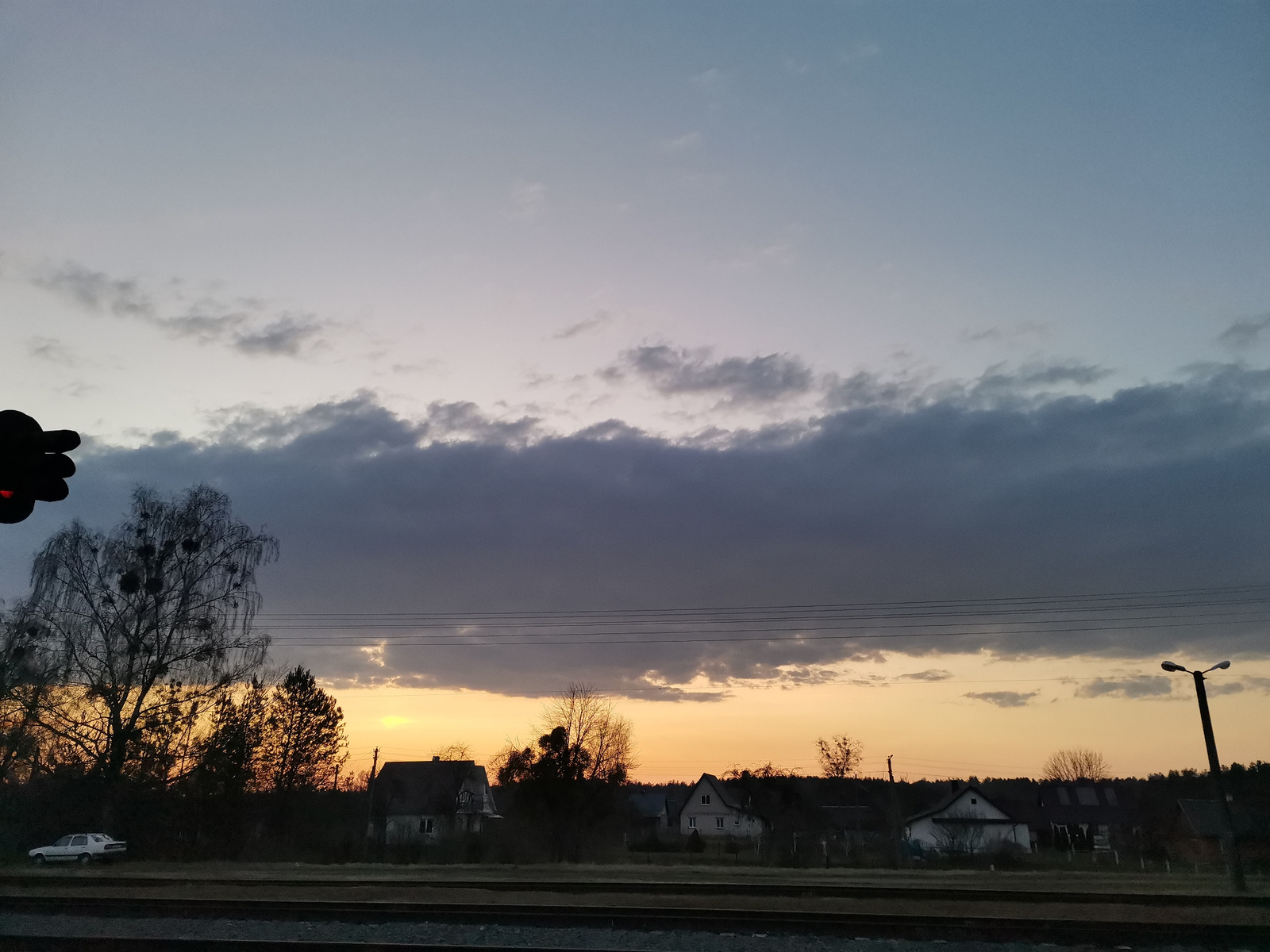 The image depicts a view from a railway location in Парэчча, Belarus, at sunset. The sky transitions from a pale blue at the top to a vivid orange-yellow at the horizon. A bank of dark, heavy clouds d…read more