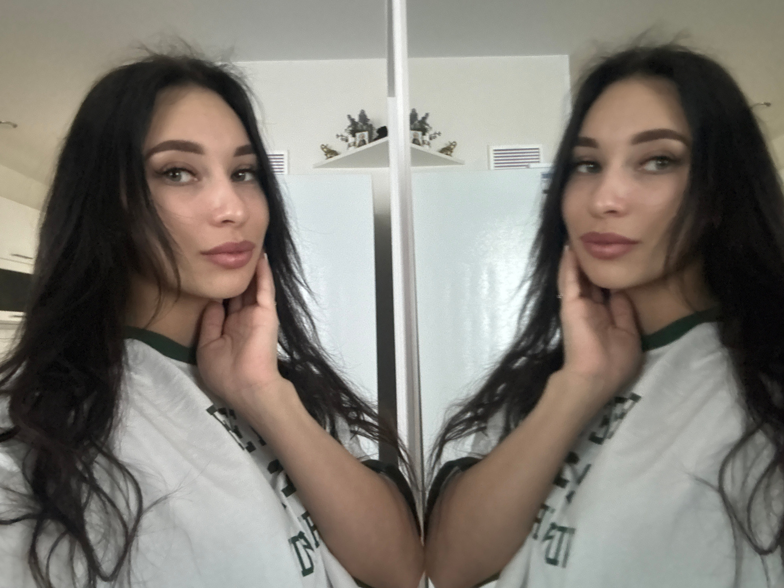 A woman is shown reflected in a mirror. She has long, dark hair, fair skin, and is wearing a white t-shirt with dark green trim. The mirror's reflection shows a white ceiling with a light fixture, an…read more