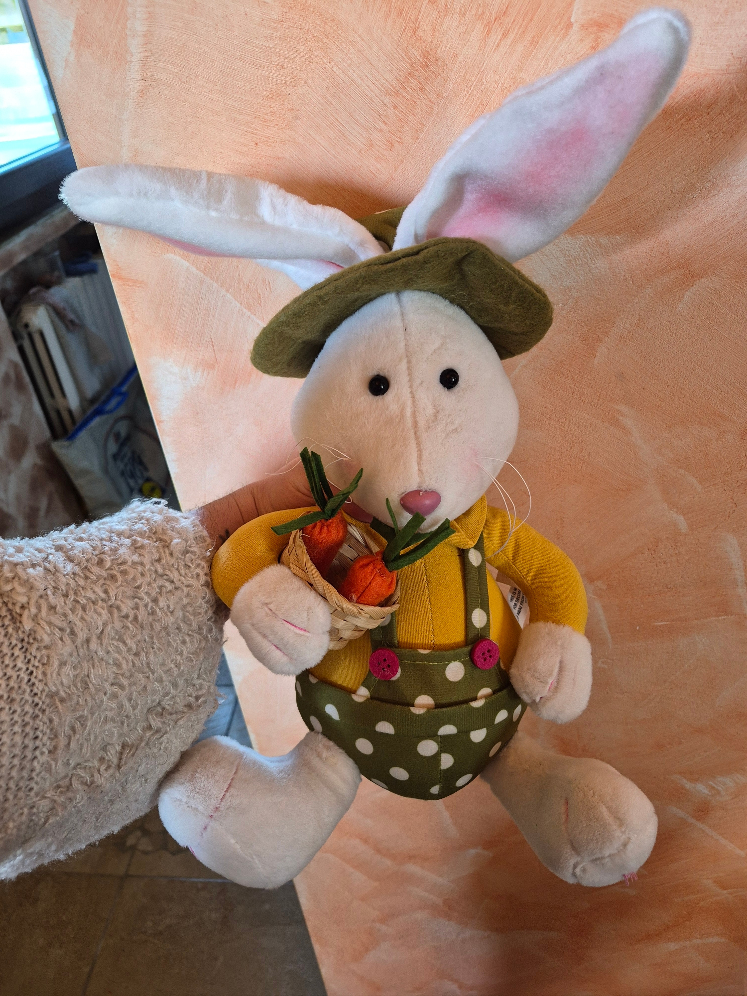 A plush toy depicting a white bunny with an elongated left ear and a shorter right ear adorned with an olive-green hat is being held by an individual wearing a cream-colored knitted sweater. The bunny…read more