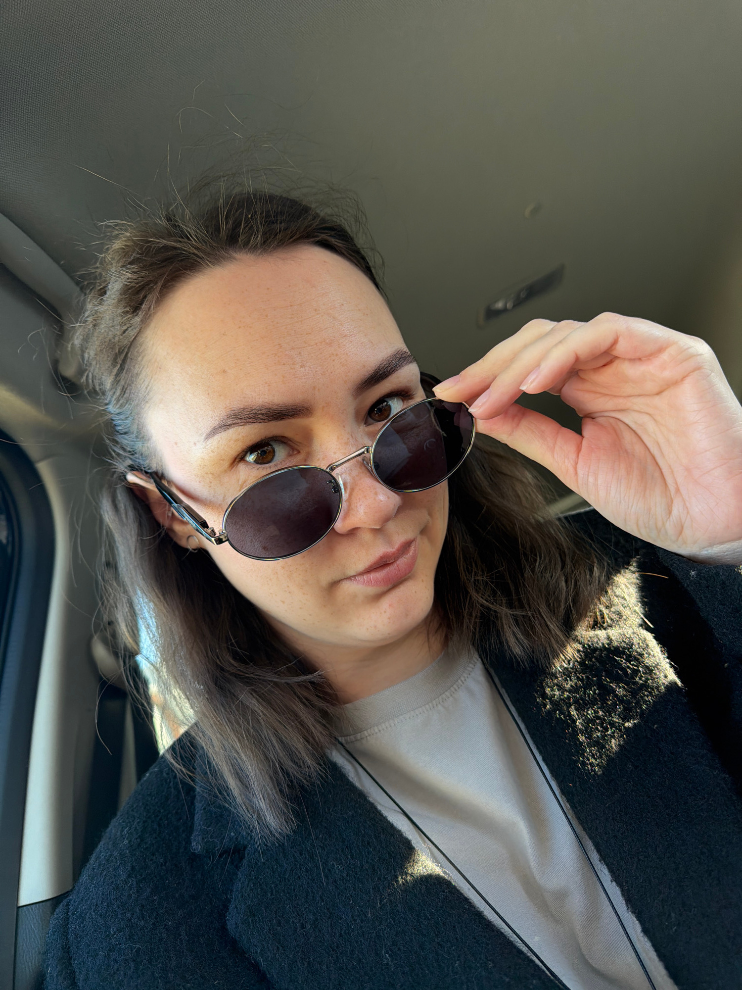 The rotated image captures a woman from a slightly low angle, positioned inside what appears to be a vehicle. She has medium brown hair, brown eyes, and visible freckles on her face. She is wearing a dark, textured jacket or coat over a lighter-colored shirt. Her hand, with neatly trimmed nails, holds a pair of round, metallic-framed sunglasses with dark lenses, resting just below her eyes. She looks directly at the camera with a neutral expression. Bright sunlight streams in, casting strong highlights on her hair, the textured fabric of her jacket, and parts of the car's interior. The background shows the grey headliner or roof of the vehicle. Faint text, "FU," is visible on the right lens of her sunglasses. The setting is indoors, likely within a car, during daytime with clear, sunny weather. The location context is Chaikovsky, Russia. | Open Wire