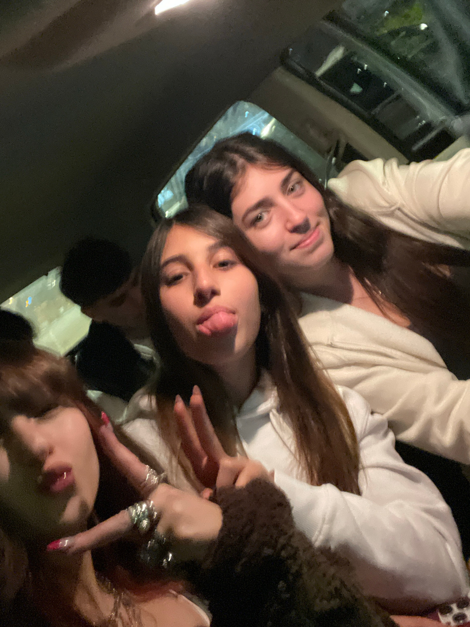 Three young women are crammed into what appears to be the back seat of a car. The woman closest to the camera has her tongue out. One is wearing a white hoodie. The location is not identifiable as Pet…read more