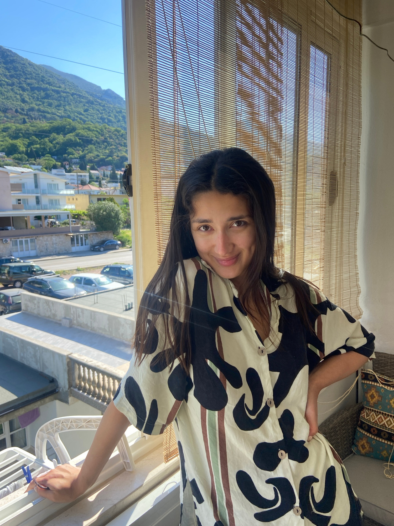 A young woman with long dark hair is captured in a relaxed pose on a sunny balcony, looking directly at the viewer with a gentle smile. She is lying down or reclining, partially supported by wicker fu…read more