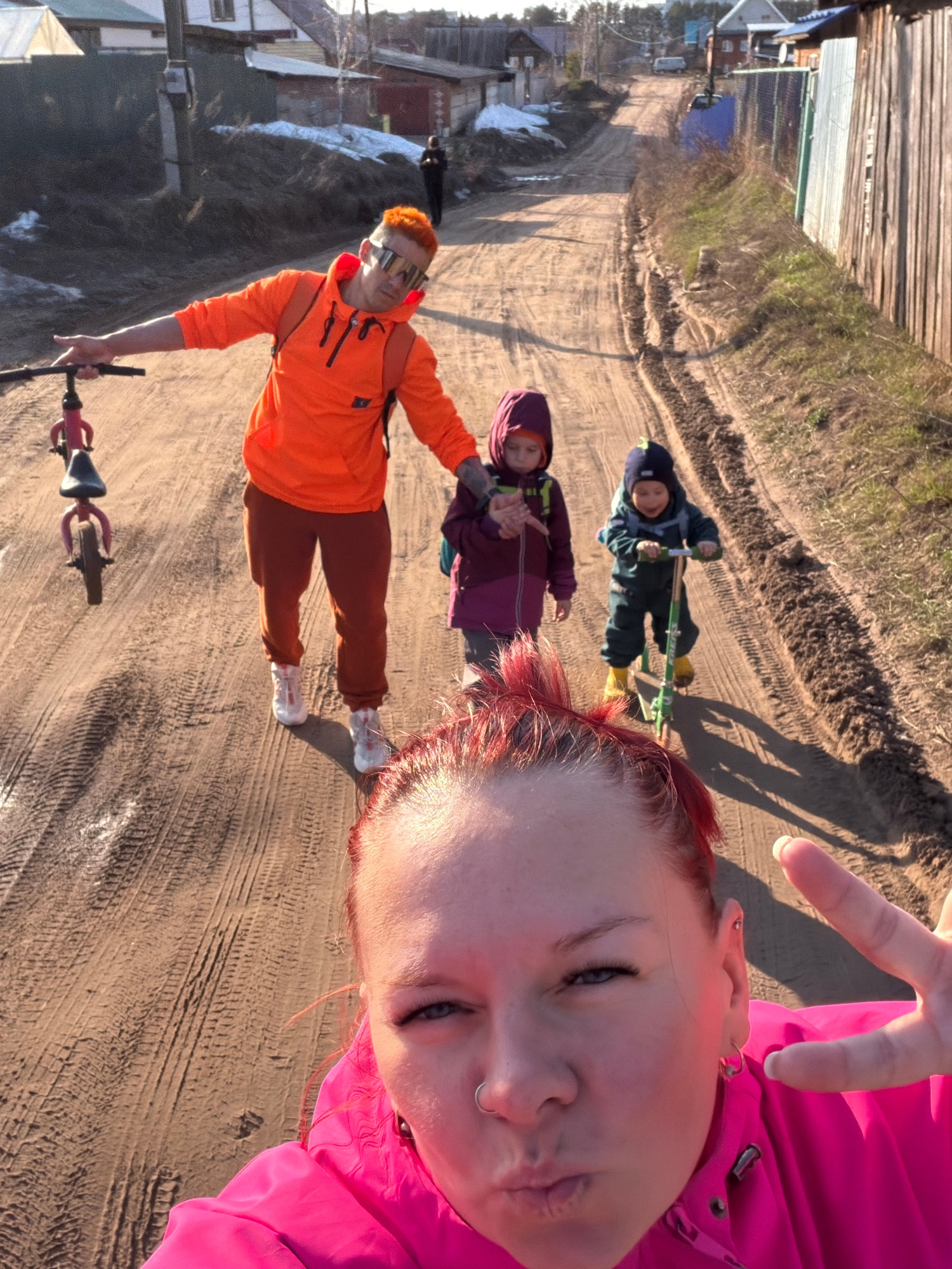 The image depicts a selfie taken in what appears to be a rural or semi-rural setting near the city of Chaikovsky, Russia. A person with red hair and a pink jacket is holding the camera. In the backgroβ¦read more