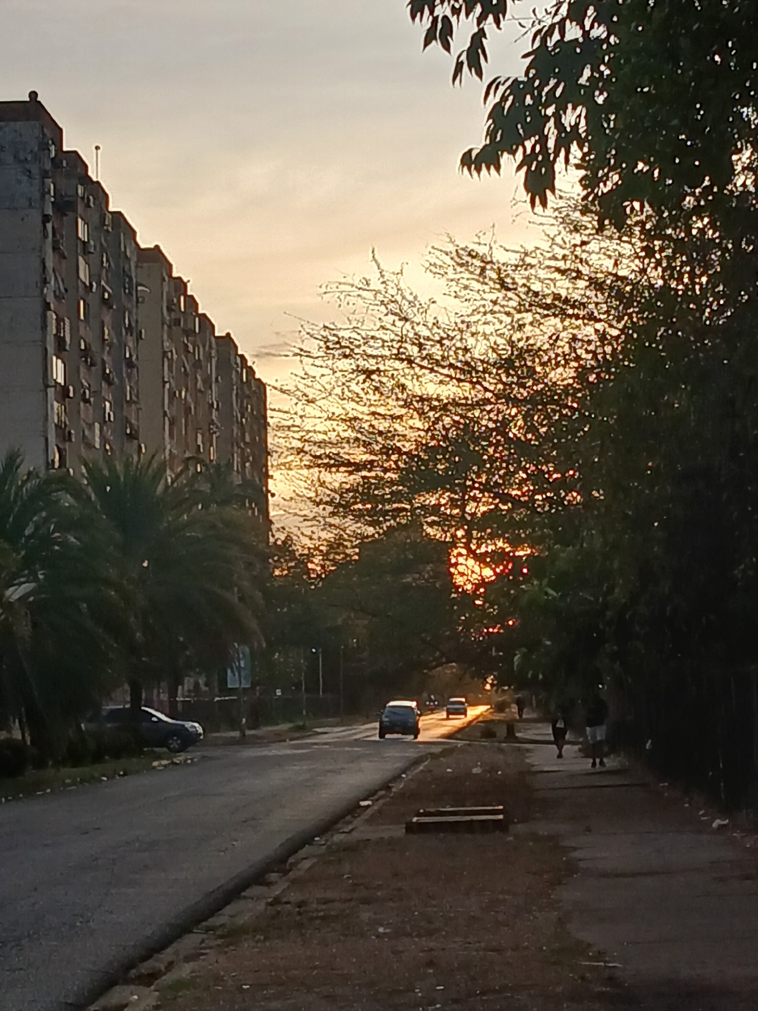 A vertical shot depicts a street scene in Ciudad Guayana, Venezuela. A tall, weathered building with multiple windows dominates the left side of the frame, partially obscured by a palm tree. A road st…read more