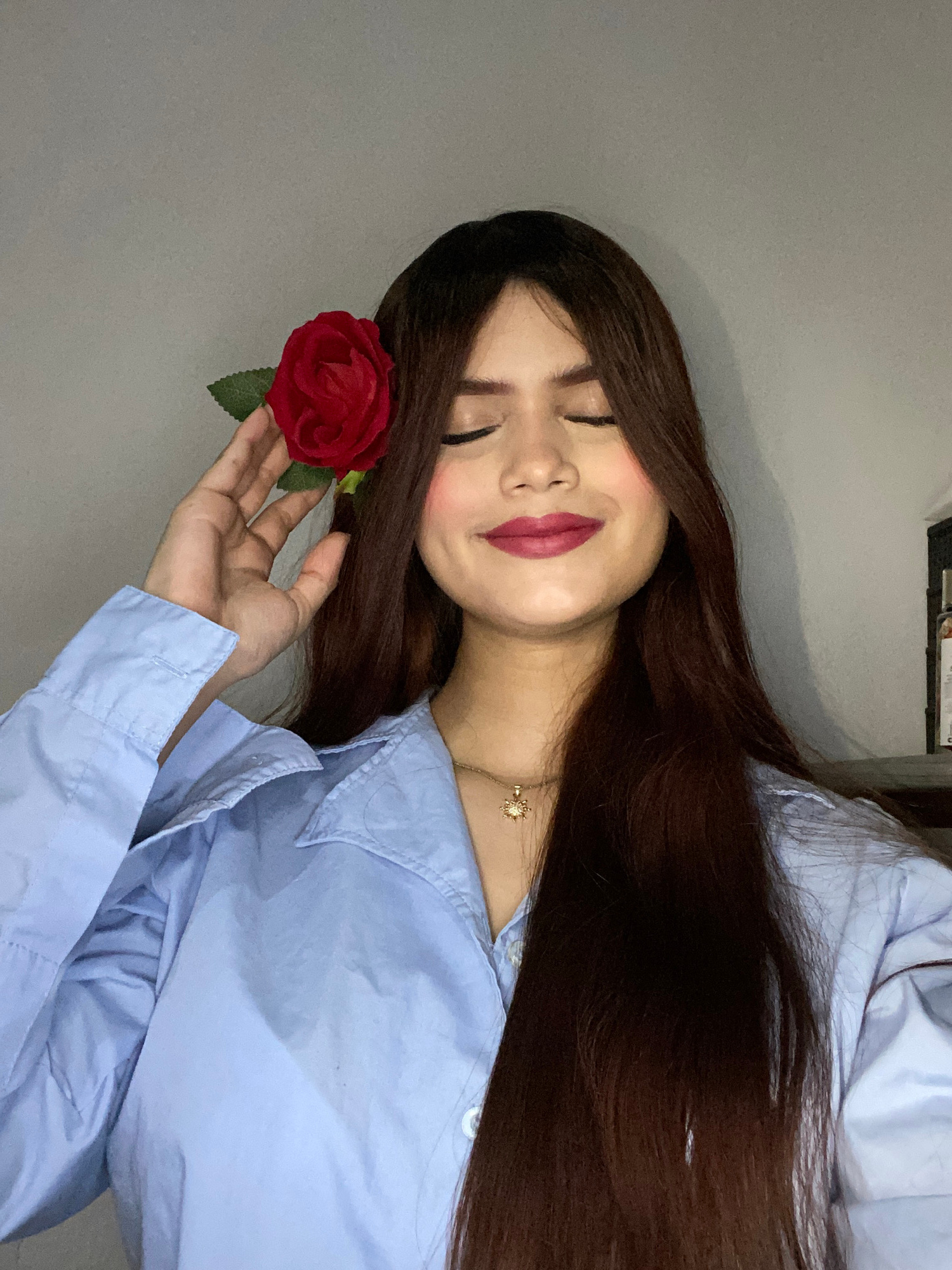 A woman with long, dark brown hair is posed in a semi-reclined position, wearing a light blue button-down shirt. Her eyes are closed and she is smiling slightly. She holds a red rose in her right hand…read more