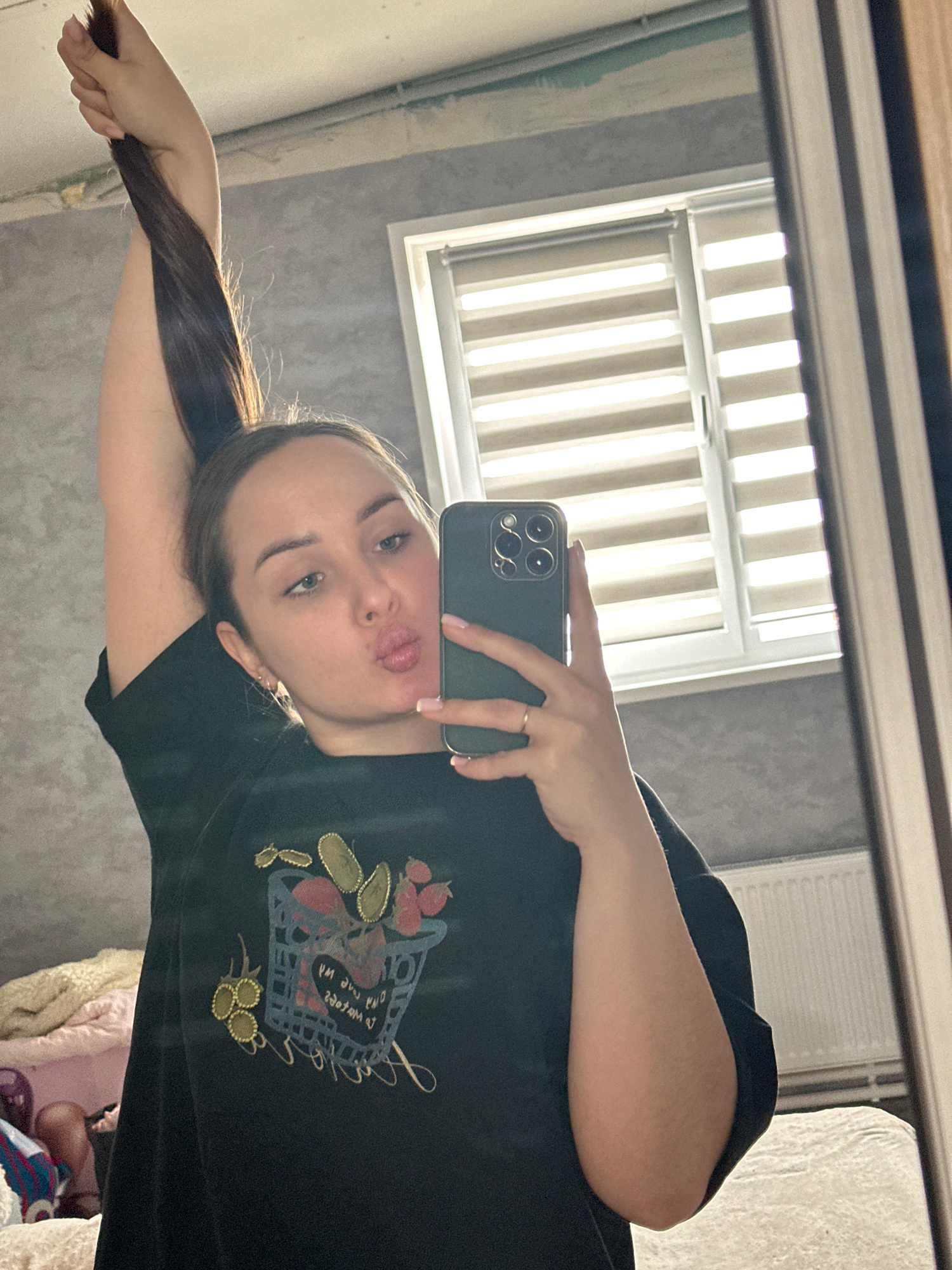 An indoor mirror selfie captures a young woman with long, dark hair, wearing a black t-shirt. The image is rotated 90 degrees clockwise. She holds a dark green or black smartphone with a triple-lens c…read more