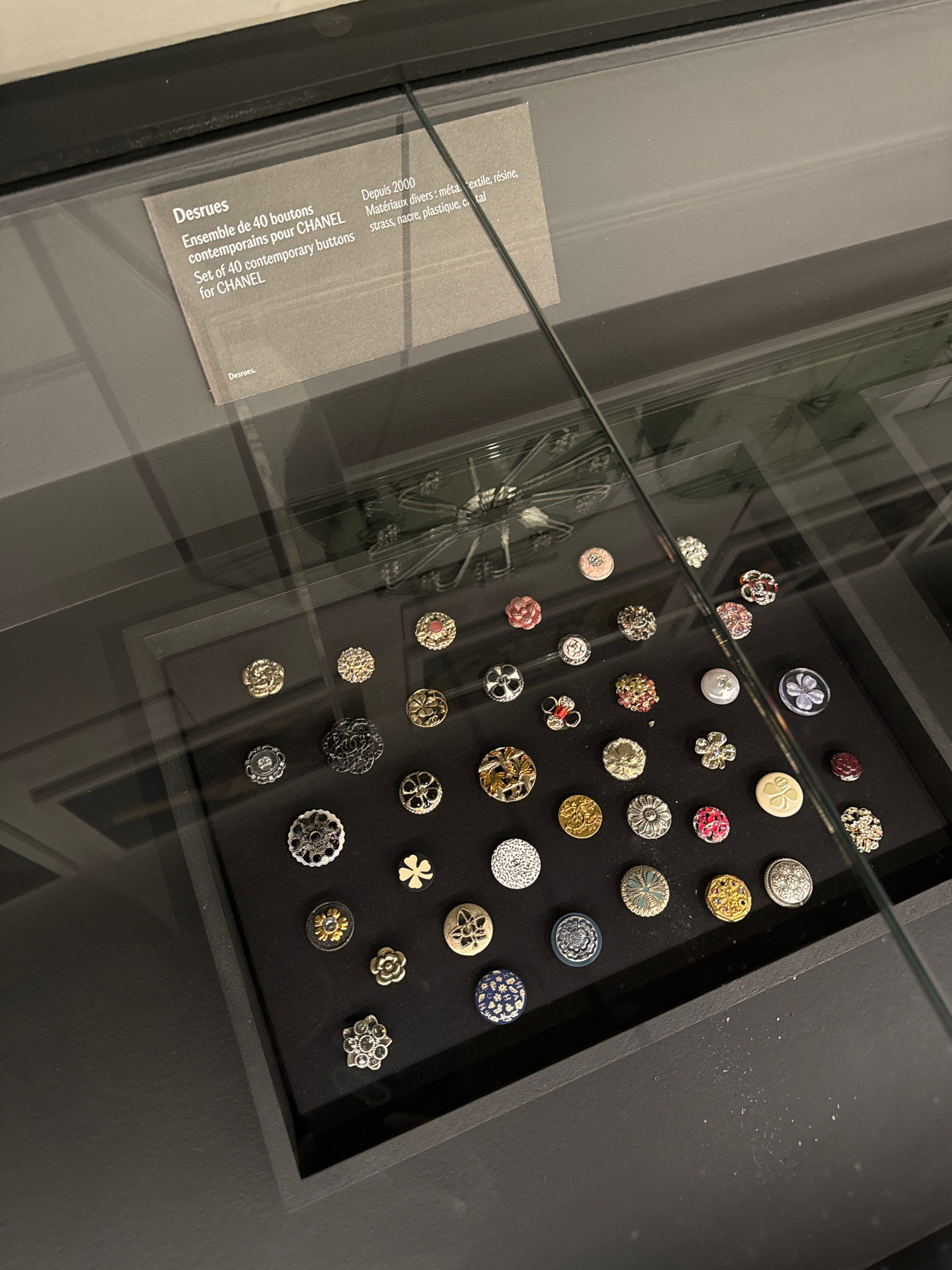 The image shows a framed collection of approximately 40 contemporary Chanel buttons, displayed behind glass, likely in a museum or gallery setting. A label on the display indicates the buttons are a s…read more