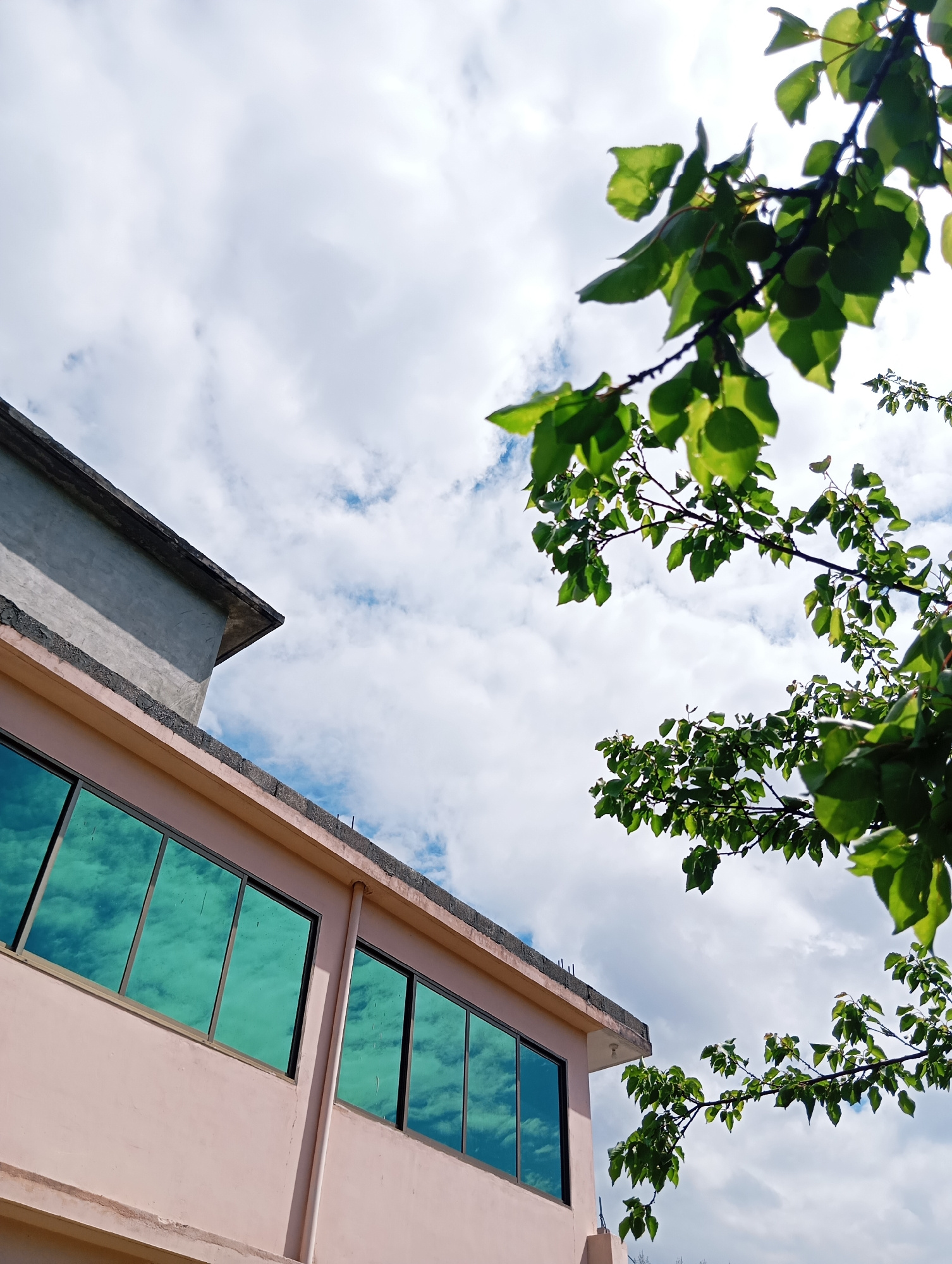 The image captures a low-angle view in Lassan, Pakistan, featuring a light pink building with reflective green-tinted windows that mirror the cloudy sky. A partially constructed grey concrete structur…read more