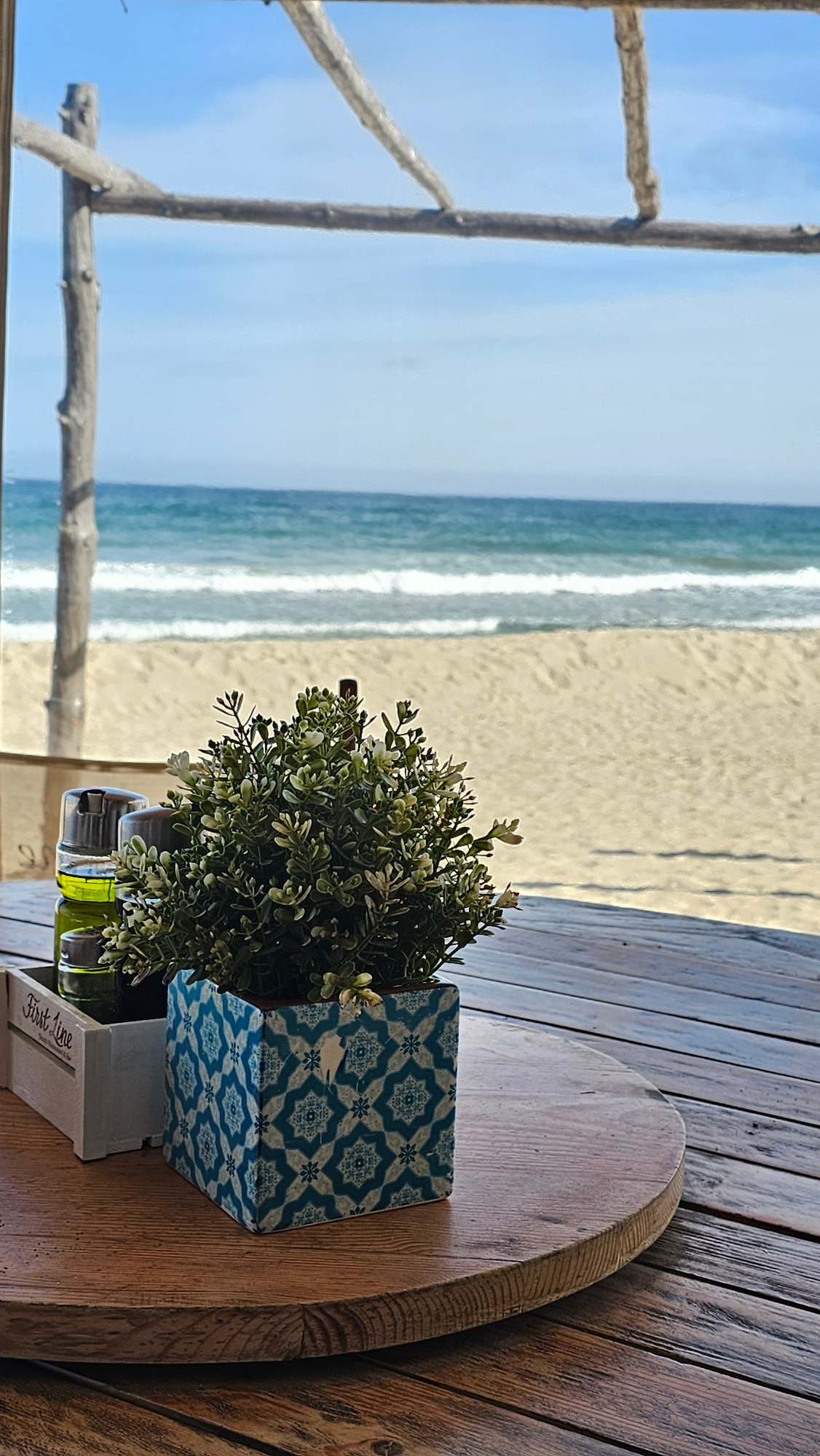 The image captures a serene beachfront view from what appears to be a cafe or restaurant in Kranevo, Bulgaria, likely taken during the day under a clear sky. In the foreground, a rustic wooden table…read more