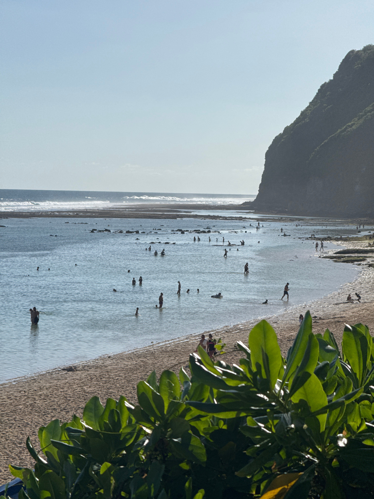 The image shows a wide, shallow beach at low tide in Kuta Selatan, Indonesia. A rocky headland rises on the left side of the frame. In the midground, many people are wading in the water. The water is…read more