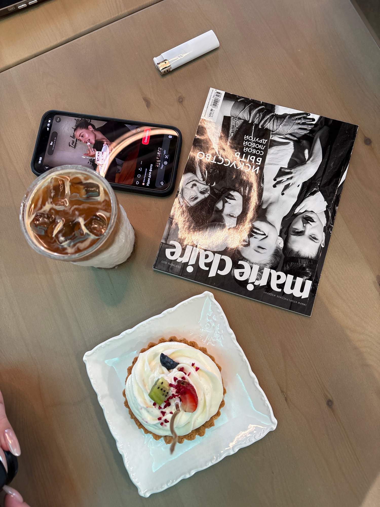 The image shows a flat lay on a wooden table featuring several items. A "Marie Claire" magazine with a black and white cover of people lying together sits near a white lighter. An iPhone displays a so…read more