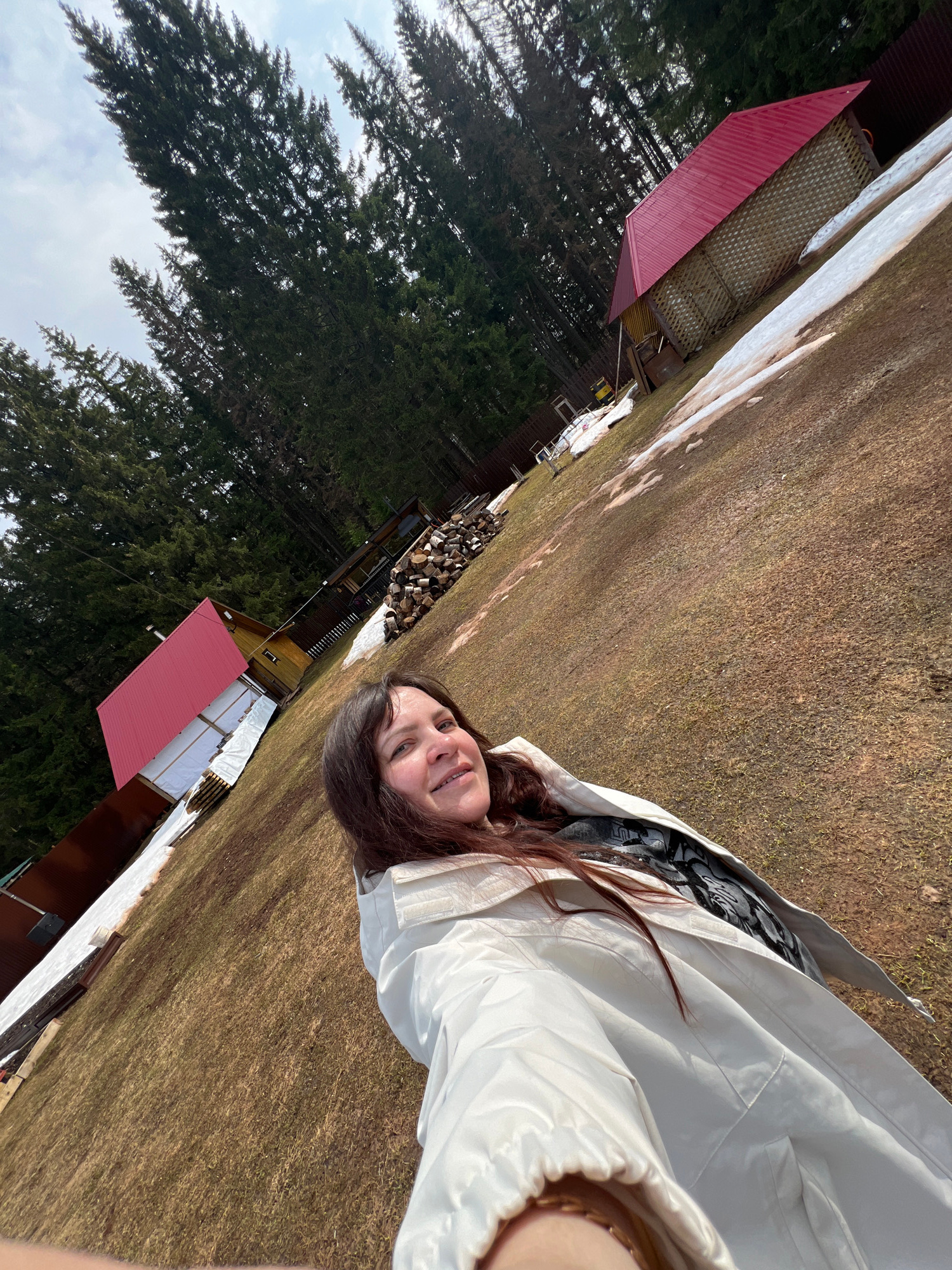 An outdoor portrait captures a young woman smiling directly at the camera, positioned on the right side of the frame. She has long, dark brown hair and is wearing a light-colored, possibly white or li…read more