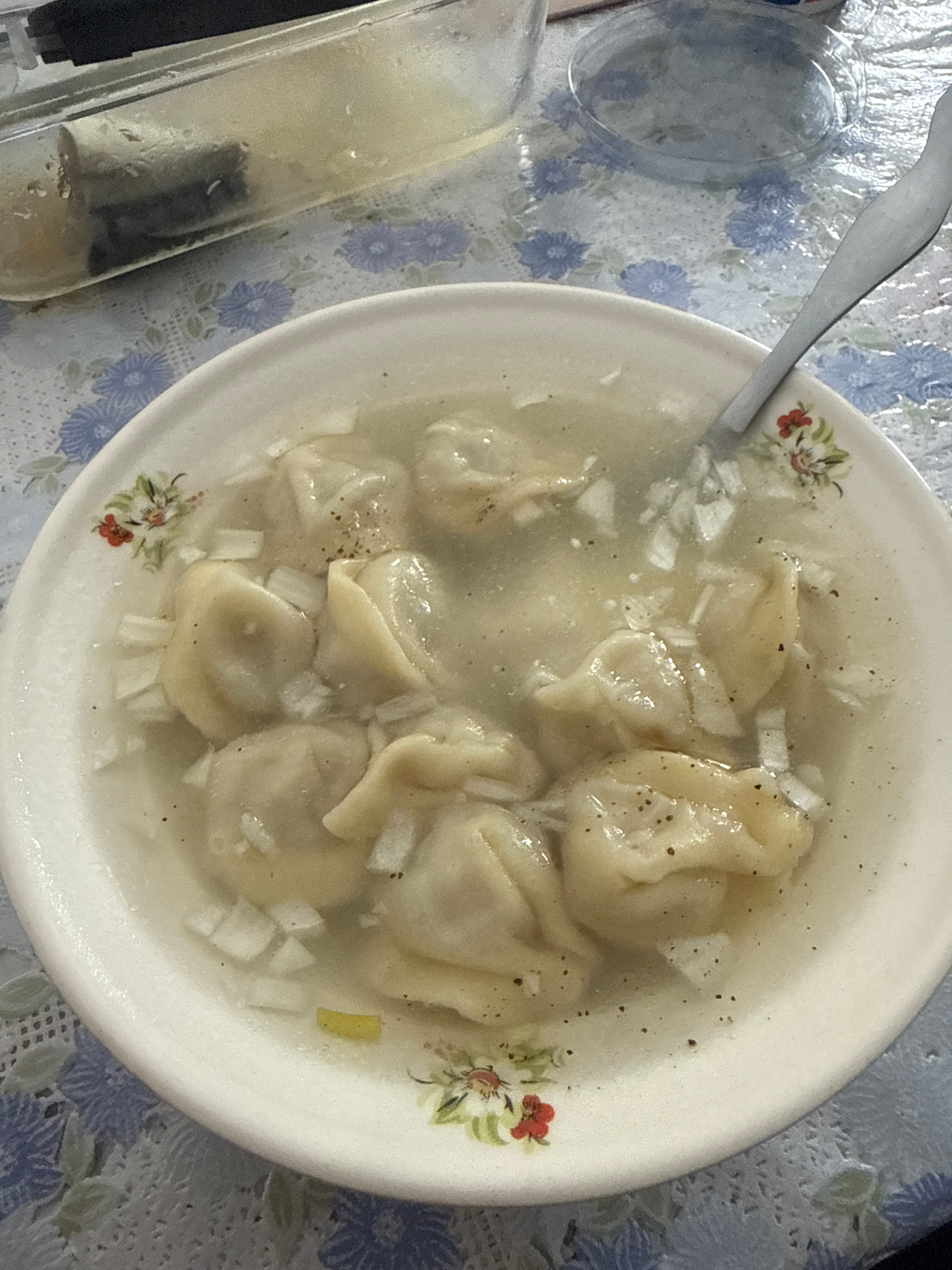 A high-angle shot depicts a white bowl of pelmeni soup on a floral tablecloth. The soup contains dumplings and diced onions. A metal spoon rests in the bowl. Adjacent to the bowl is a clear container…read more