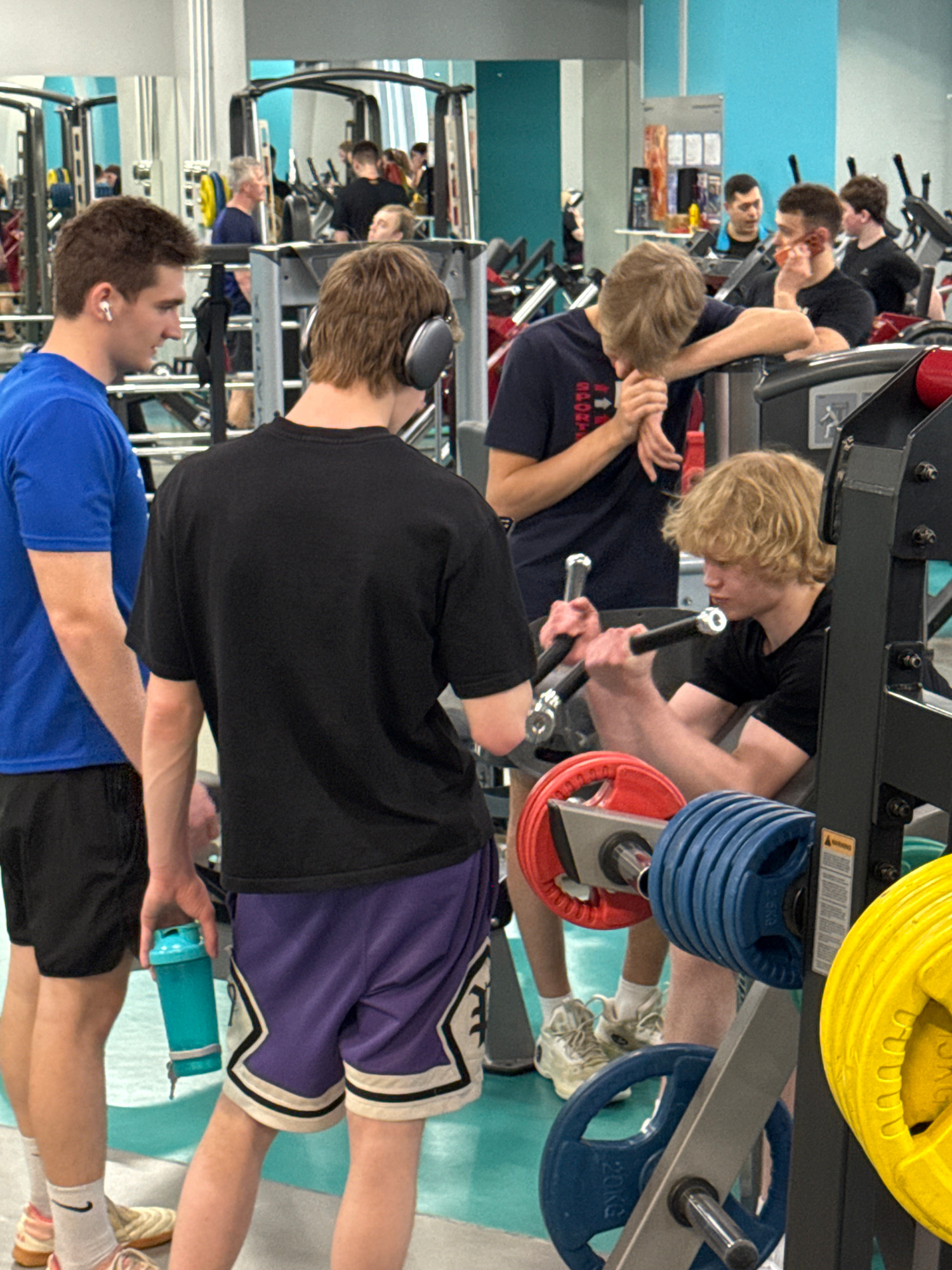 The image depicts a gym setting with multiple individuals engaged in exercise. Several people are using weight machines. The equipment is loaded with various colored weight plates. The gym has a teal-…read more