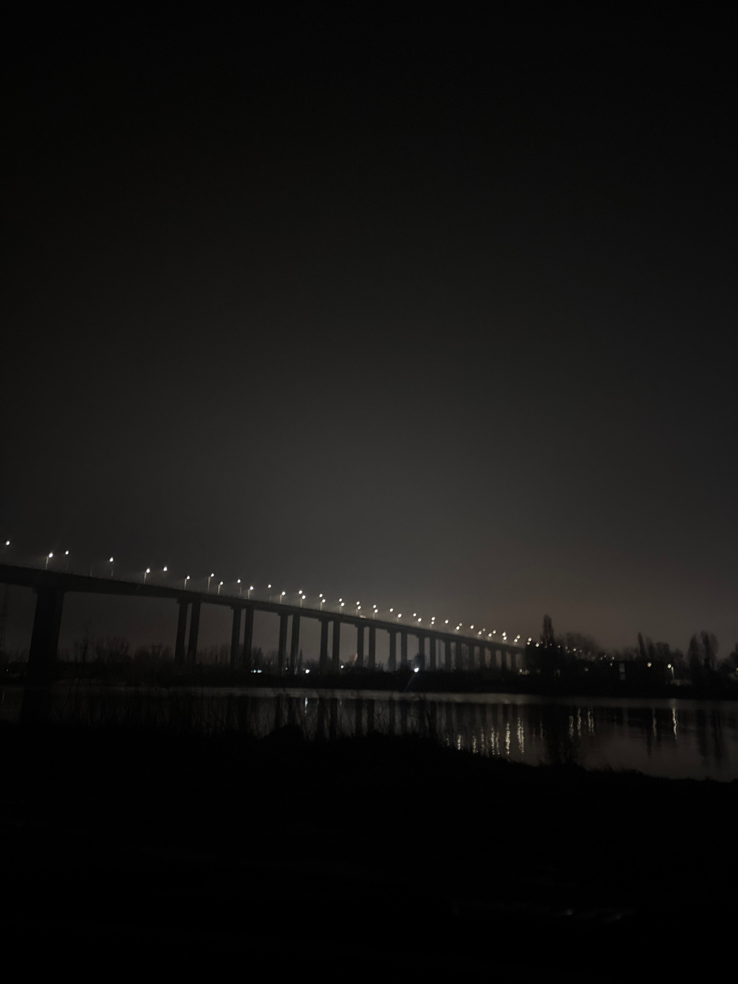 The image depicts a night scene of a bridge in Varna, Bulgaria, heavily obscured by fog. The bridge is lined with lights, illuminating its structure against the dark, foggy sky and water below. The br…read more