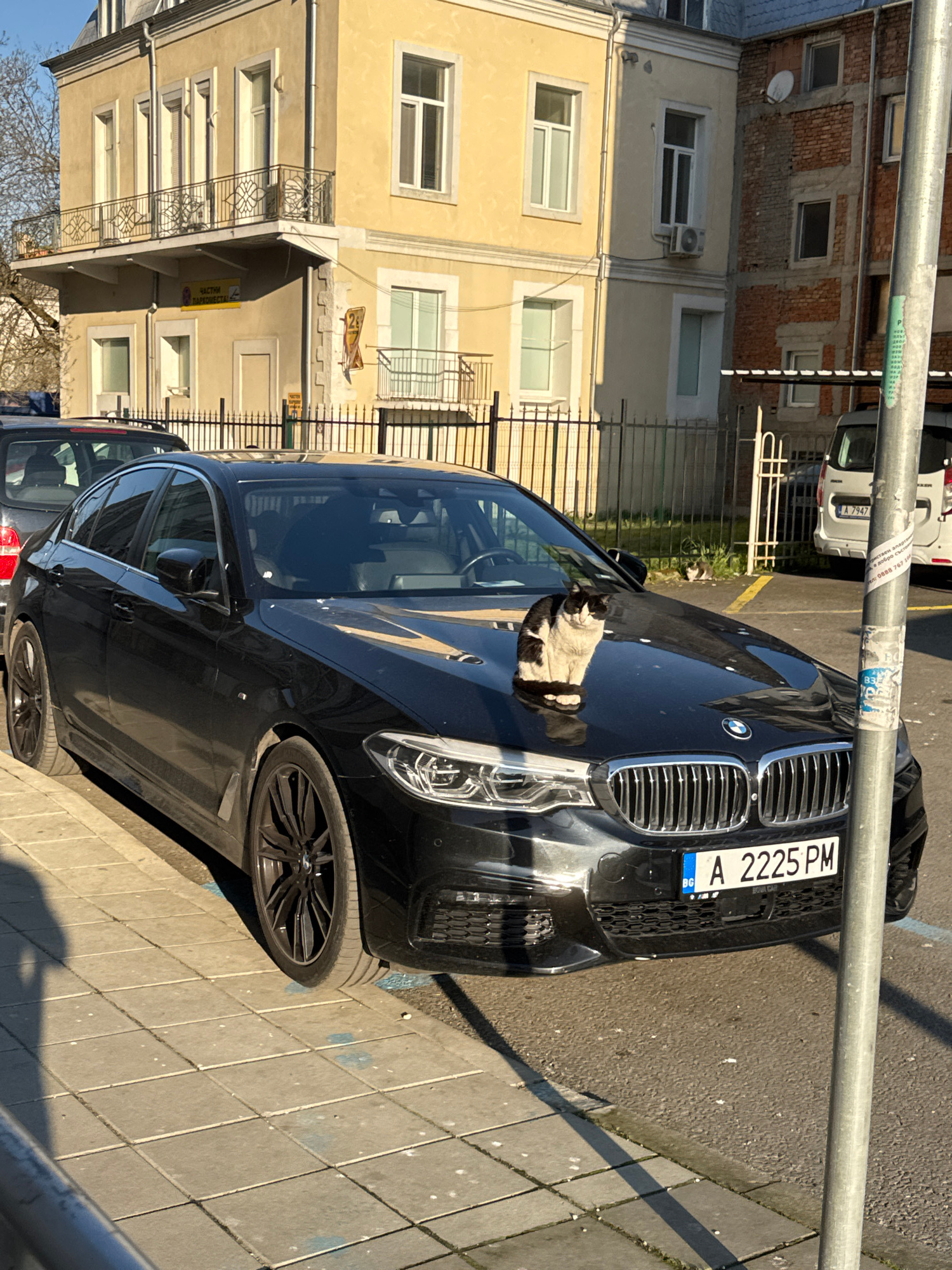 The image shows a black BMW sedan parked on a street in Burgas, Bulgaria. The car has a Bulgarian license plate reading "A 2225 PM." A black-and-white cat is sleeping on the hood of the car near the windshield. In the background, there are apartment buildings with windows and balconies, typical of urban residential areas. A street pole is visible in the foreground. Another car can be seen parked behind the BMW. | Open Wire