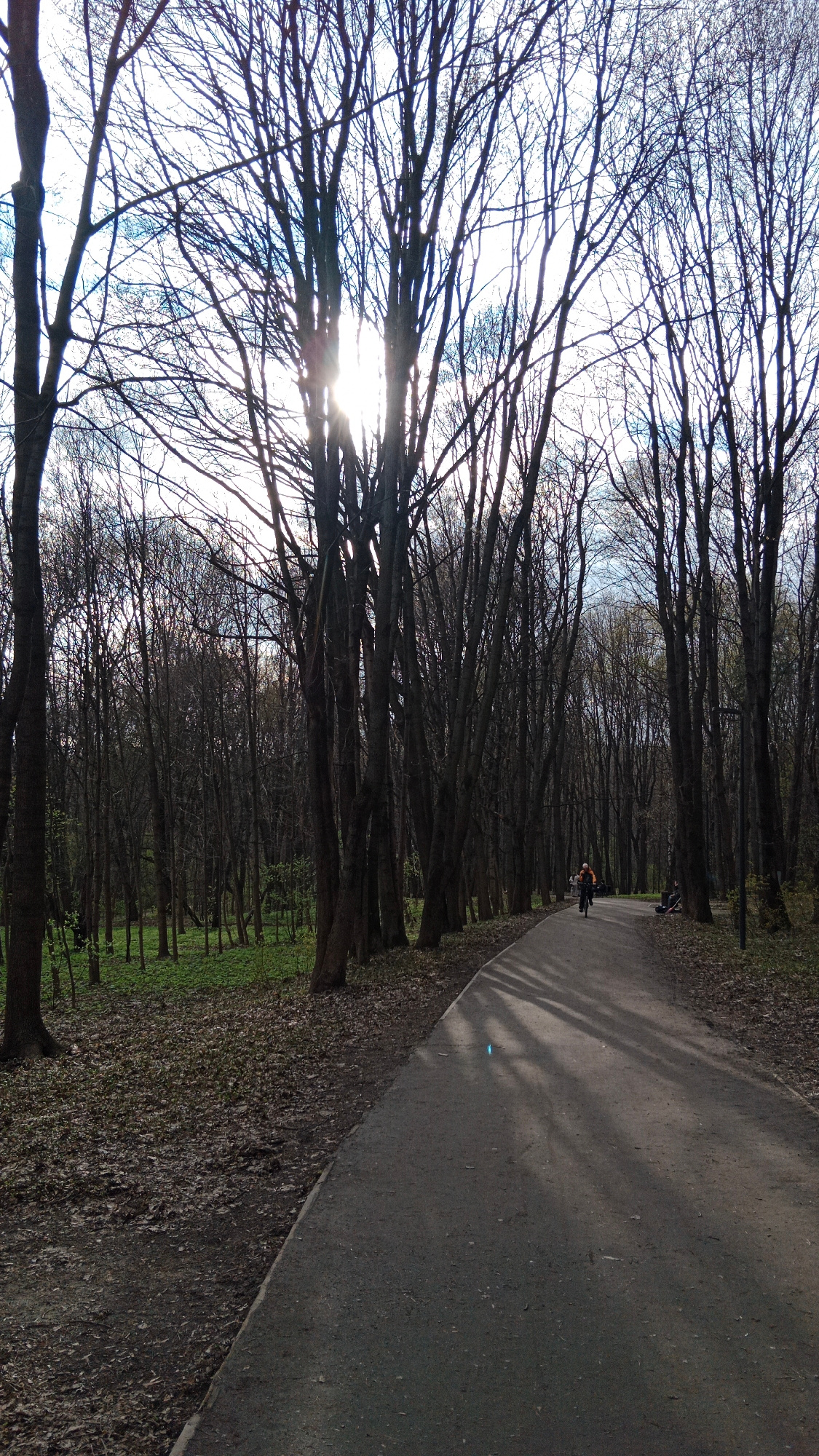 A park scene in Moscow, Russia, depicts a paved pathway winding through a dense stand of bare trees, likely in late winter or early spring. The pathway, dark gray asphalt, curves gently to the right a…read more