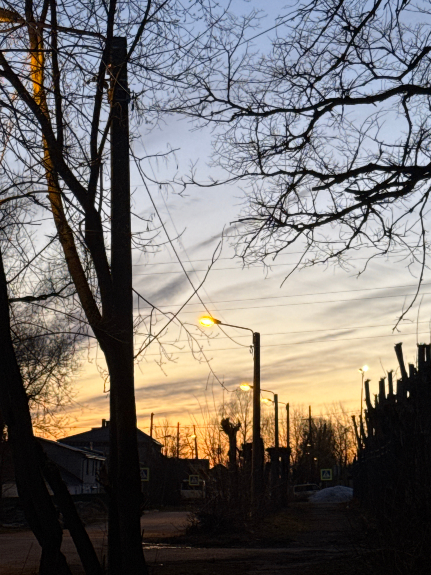 The image shows a street scene in Usolye, Russia, at dusk. The sky is a mix of grey and orange, likely indicating a sunset. Silhouetted tree branches fill the foreground. A row of lit streetlights lin…read more