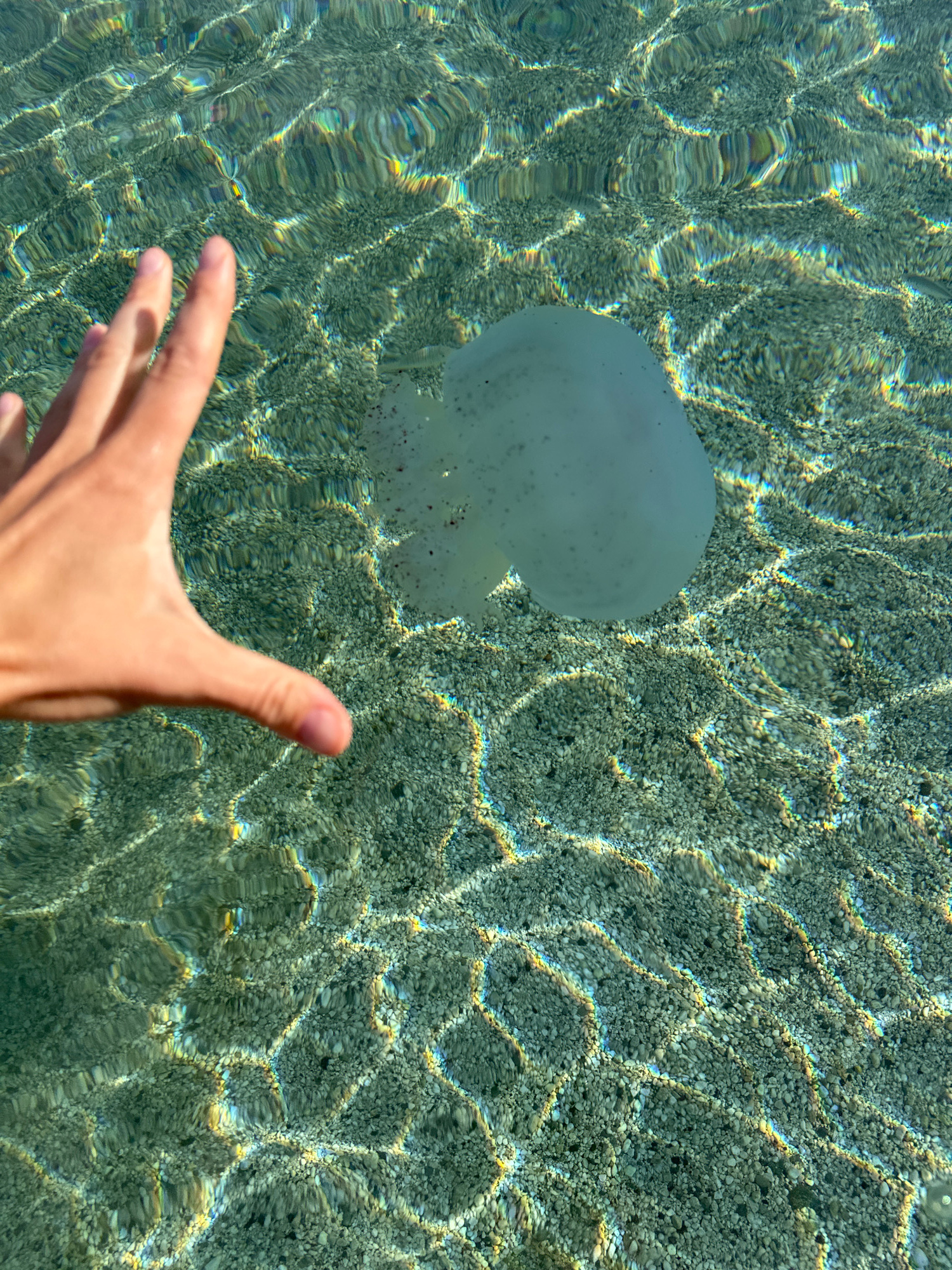 A jellyfish is floating in clear, shallow water with a sandy bottom. A human hand is extending towards the jellyfish, but not touching it. The water appears to be near a shoreline, possibly in Unknown…read more