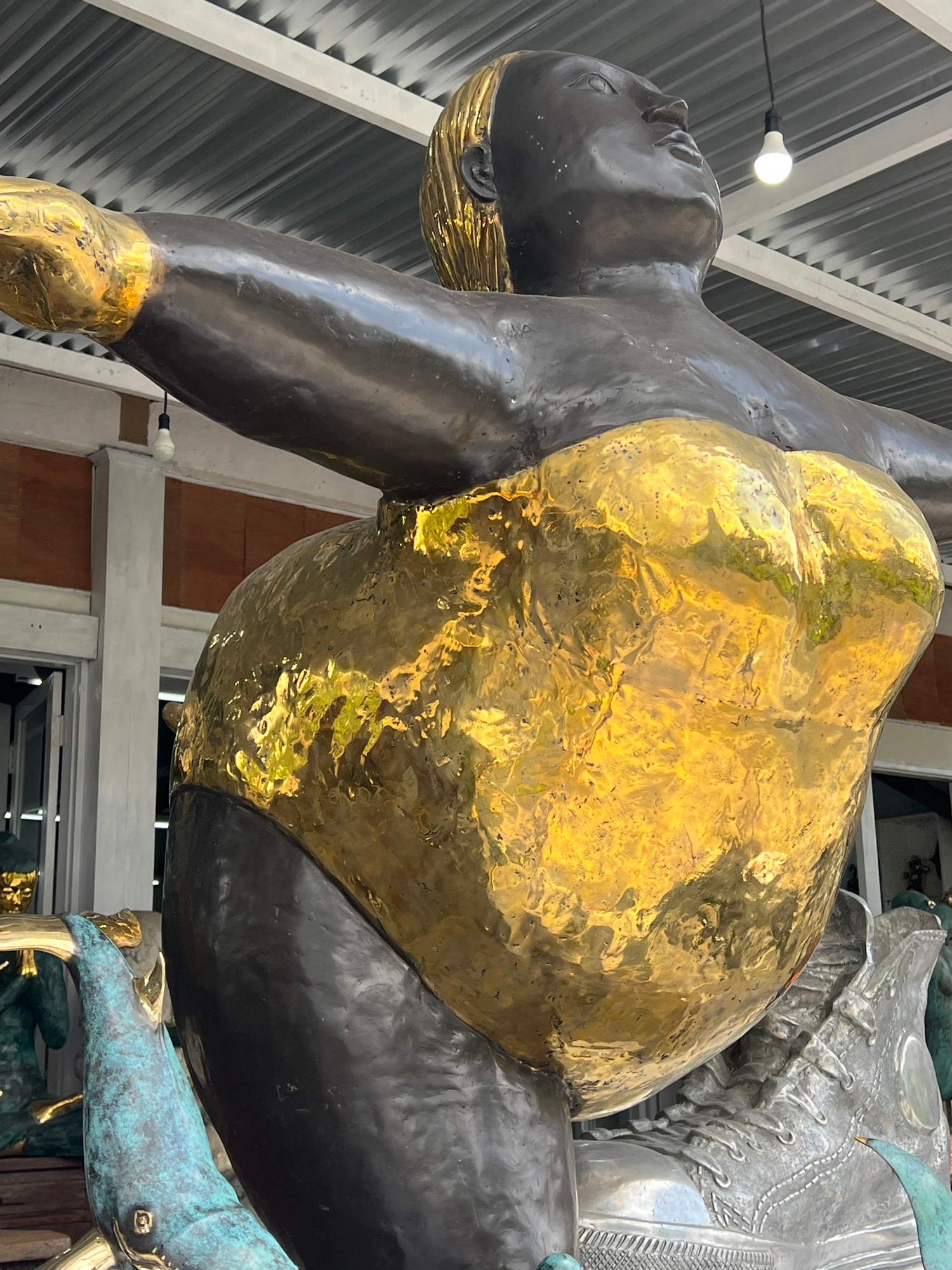 The image captures a statue in Tegallalang, Indonesia. The statue depicts a dark-skinned figure with golden accents. The figure is leaning backward, with one arm raised and the other supporting its we…read more