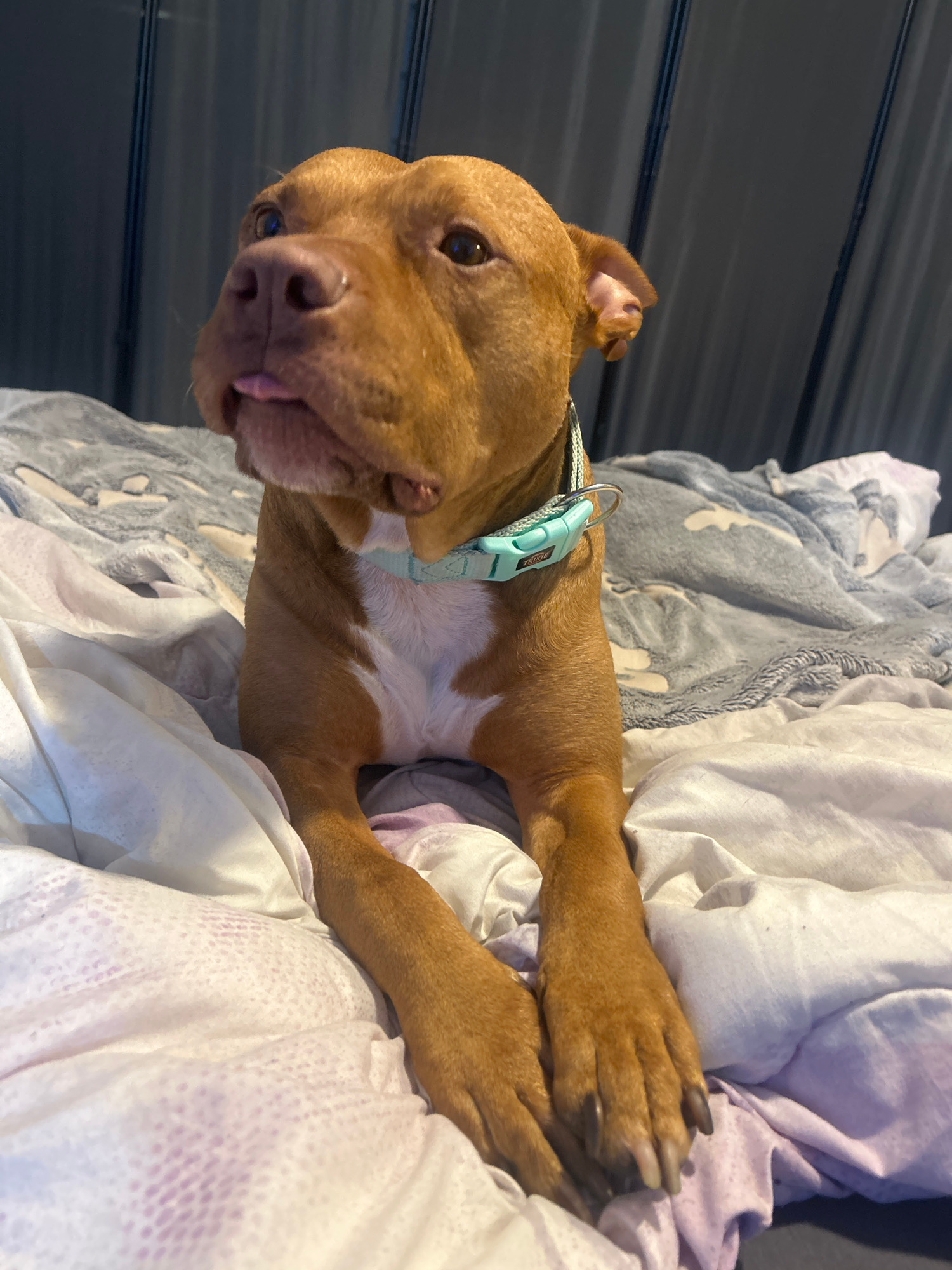 A reddish-brown pitbull-type dog is lying on a bed covered in crumpled white and gray patterned sheets. The dog wears a light blue collar. Its paws are visible near the edge of the sheets, and its ton…read more