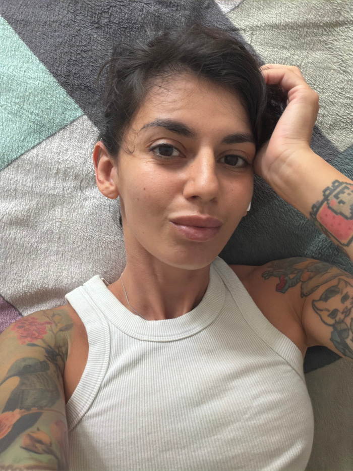 A female individual is depicted in a close-up, overhead shot, likely lying on a bed or soft surface, in Nusa Dua, Indonesia. She possesses a medium skin tone, dark, short, disheveled hair, and is look…read more