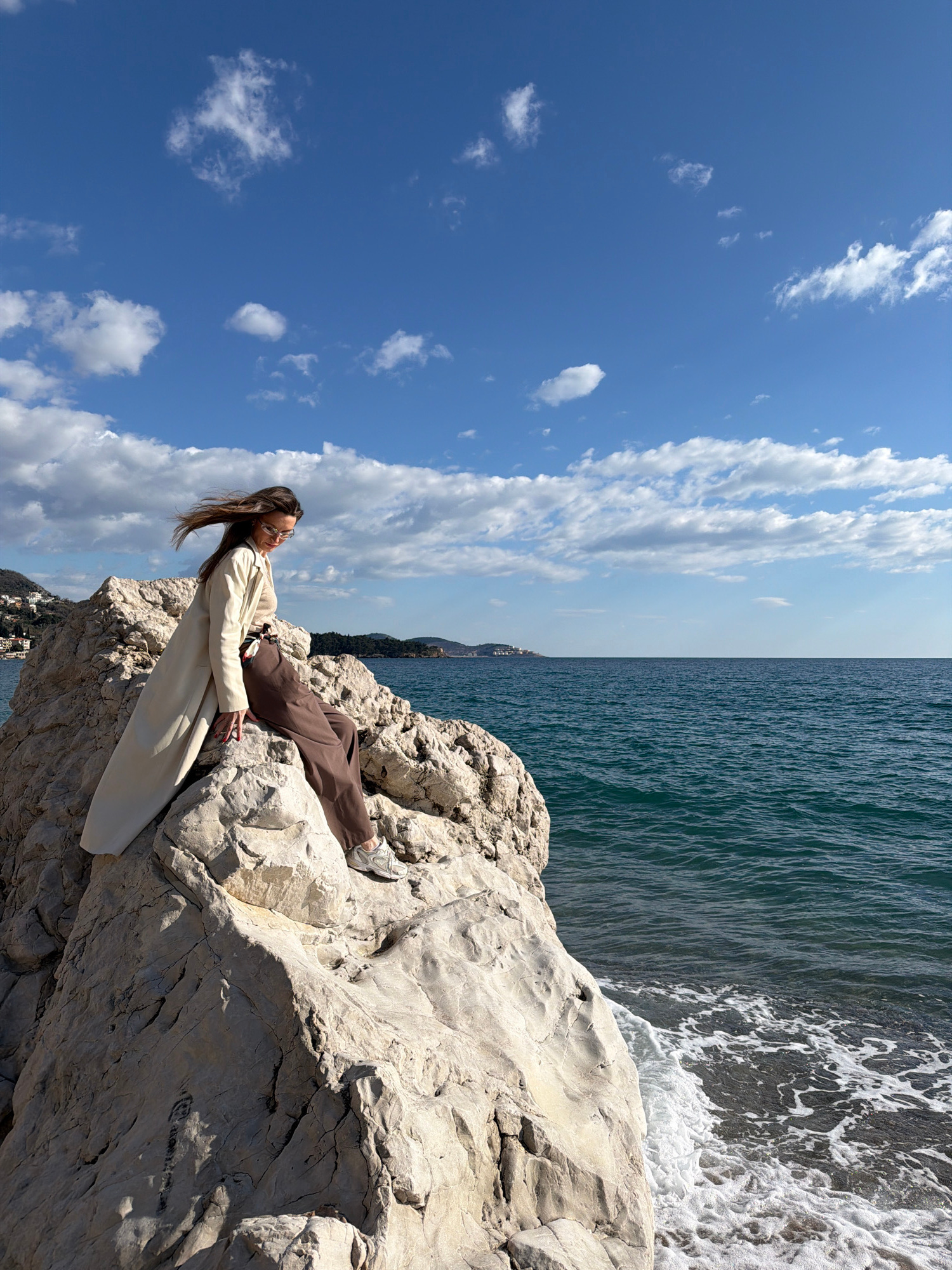 A female individual is positioned on a large, light-colored rock formation at the edge of the Adriatic Sea in Sutomore, Montenegro. She is seated facing towards the right side of the frame, with her h…read more