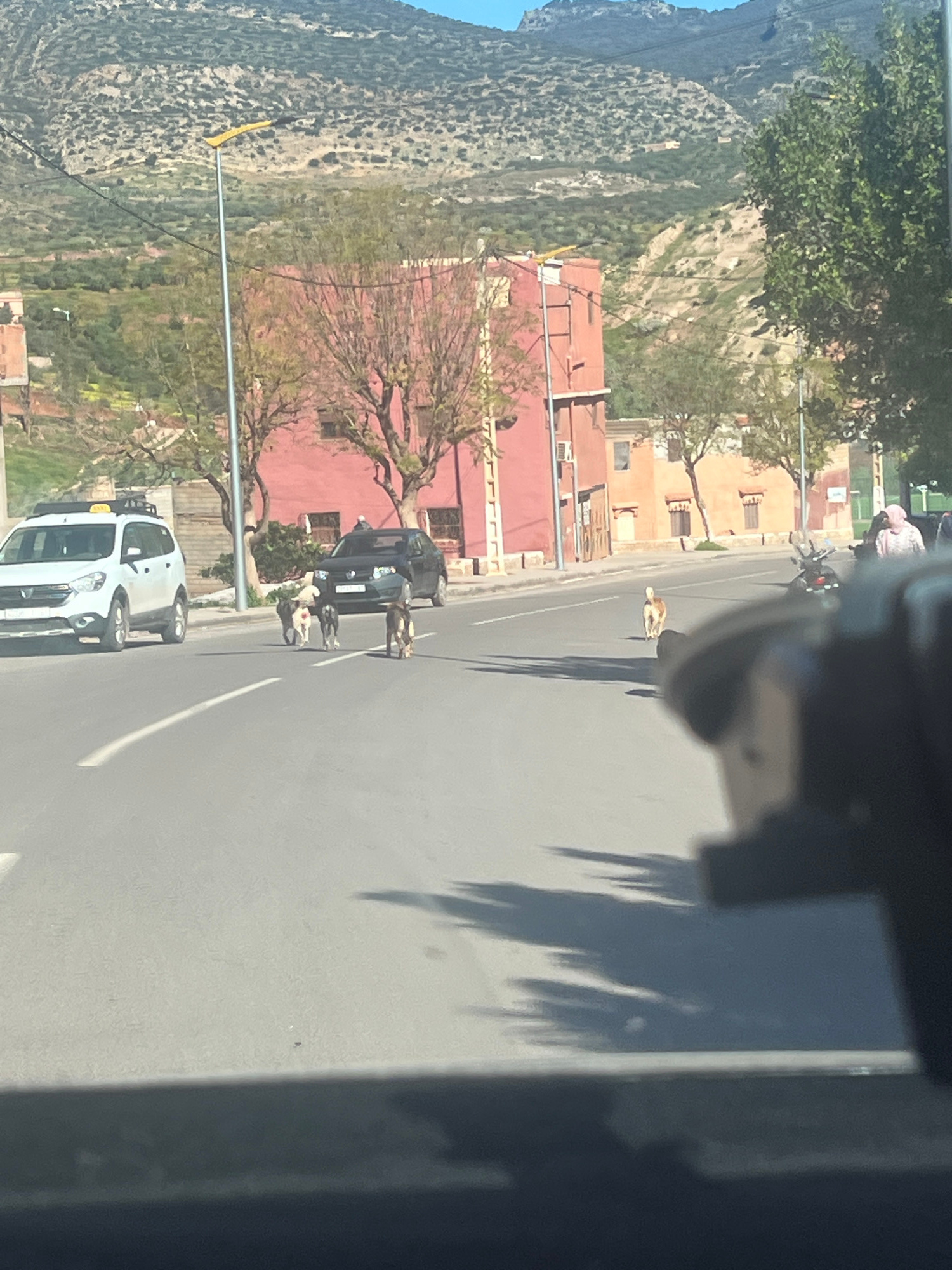 The image shows a view from inside a vehicle, looking out onto a street in Ouaouizert, Morocco. The road is lined with buildings, including a distinctive red-brick structure with multiple stories. The…read more