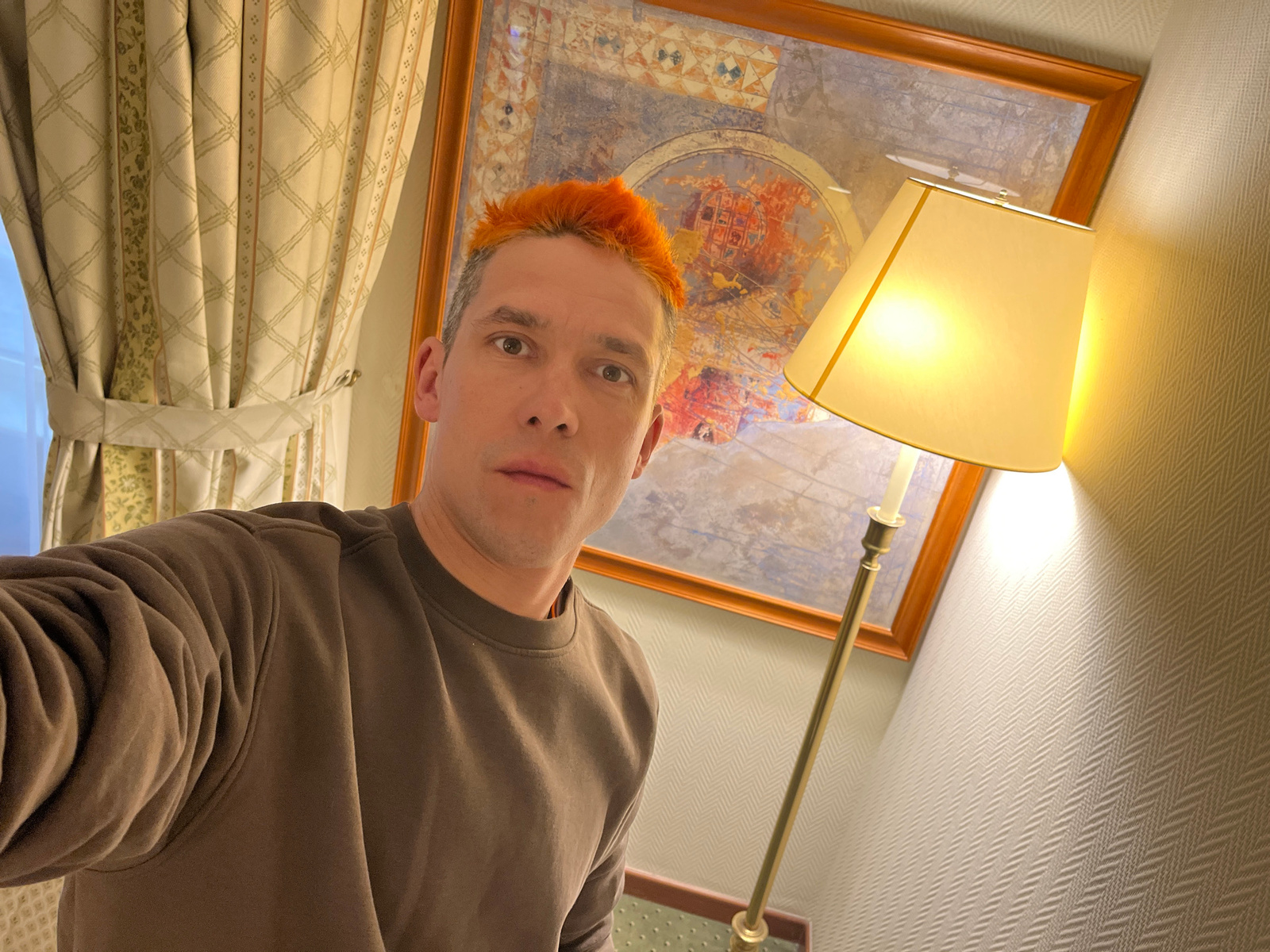 The image shows a man with orange hair looking down at the camera. He is wearing a brown sweatshirt. Behind him is a framed painting, a lamp, textured wallpaper, and a curtain. The location is likely…read more