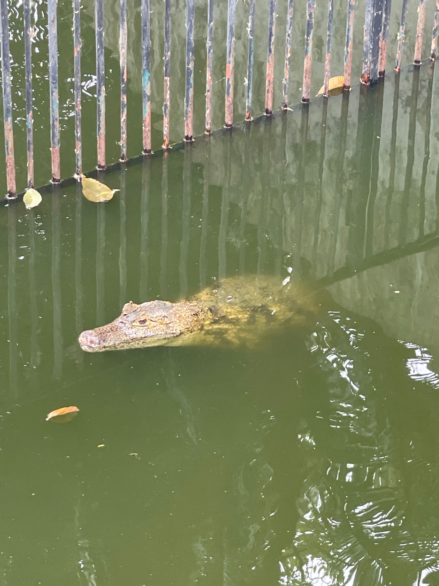 An olive-green body of water in Caracas, Venezuela, features a partially submerged crocodilian, likely a caiman, positioned with its head and upper back visible. The reptile's mottled brown and olive-…read more