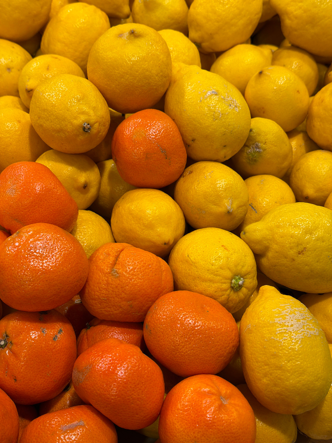The image presents a vibrant, close-up, high-angle view of a large pile of citrus fruits, predominantly bright yellow lemons interspersed with several smaller, bright orange tangerines or small orange…read more