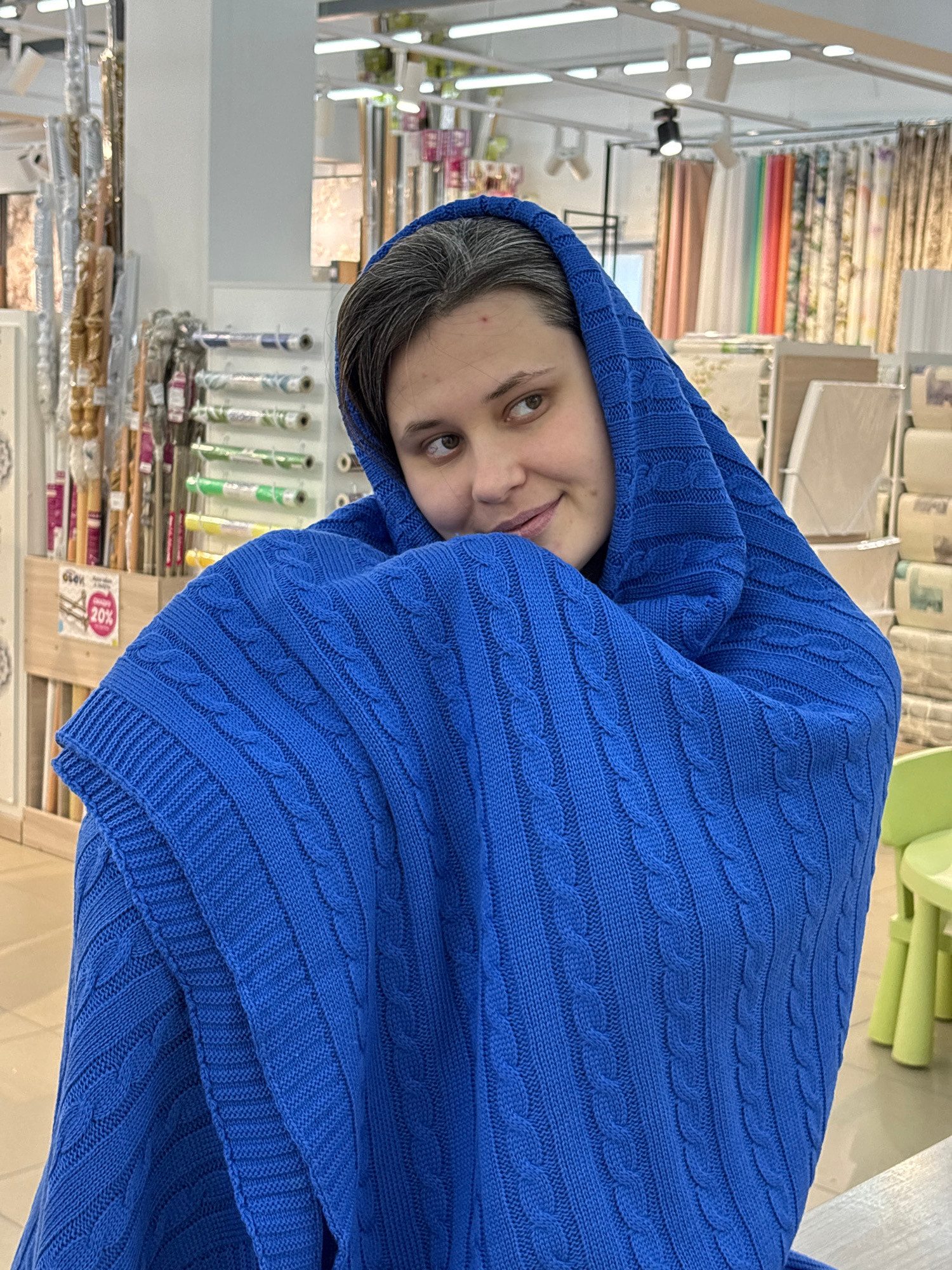 A woman with gray hair and pale skin looks at the camera while wrapped in a blue, knitted shawl or blanket. The setting is a retail store, likely specializing in textiles or fabrics. Shelves filled wi…read more