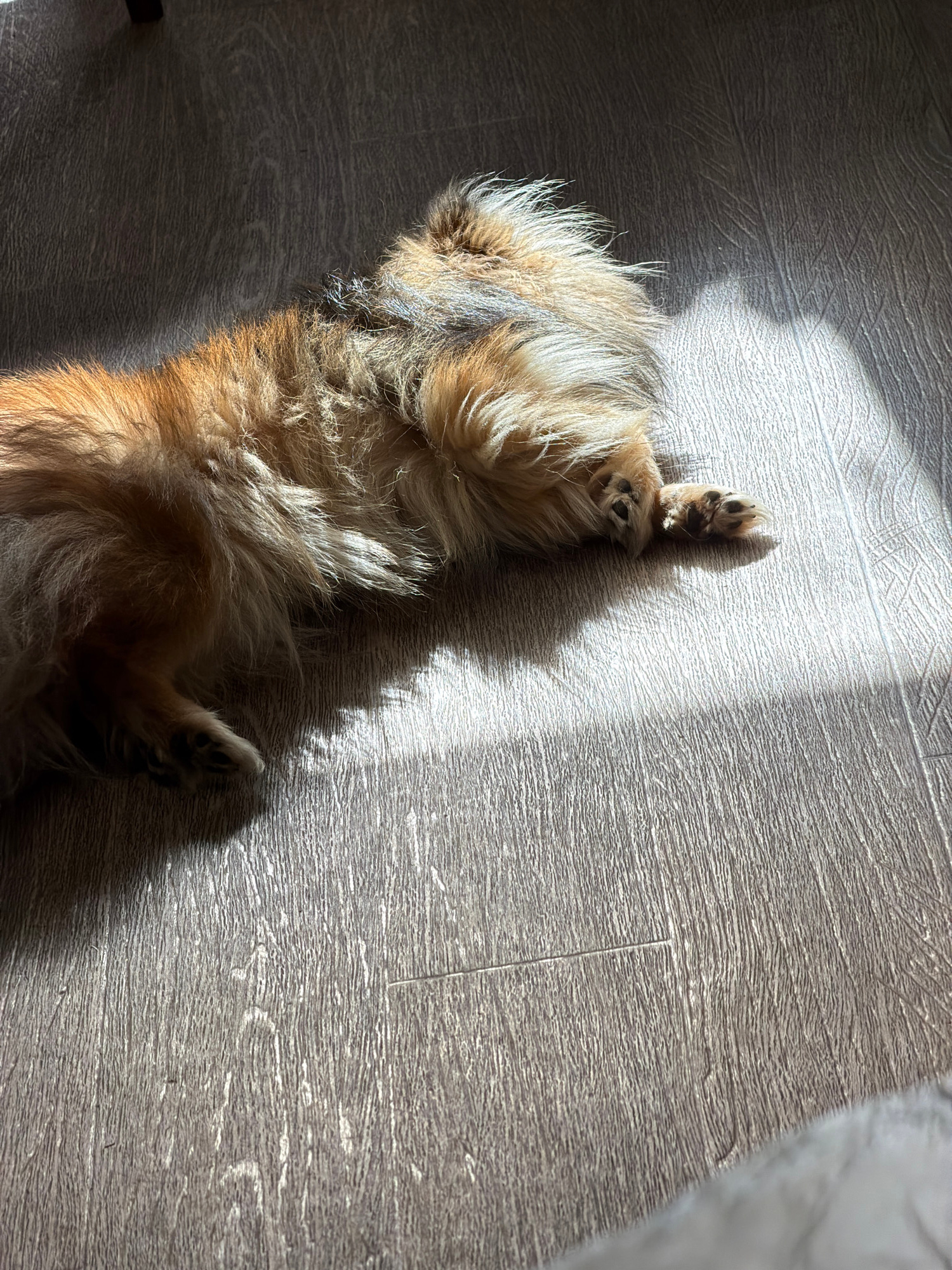 A small, brown and tan, long-haired dog is lying on its back on a wood-look floor. The dog's paws are visible, one pair stretched upwards and the other near its belly. The dog is mostly in shadow. The…read more