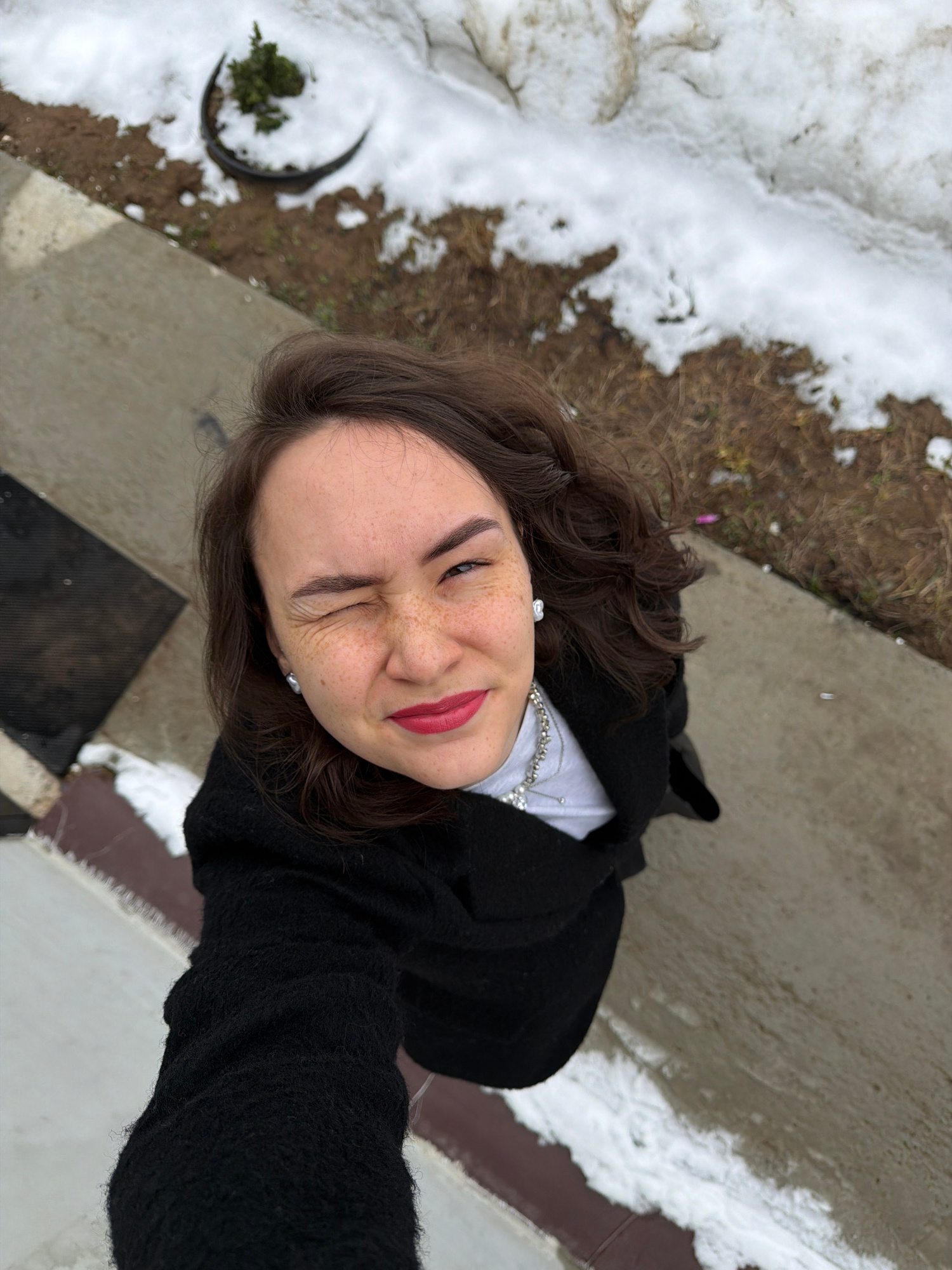A young woman is pictured in a selfie taken outdoors. The camera is held at an angle looking up at her. She is wearing a black coat and a light-colored top with a silver necklace. The woman's right ey…read more